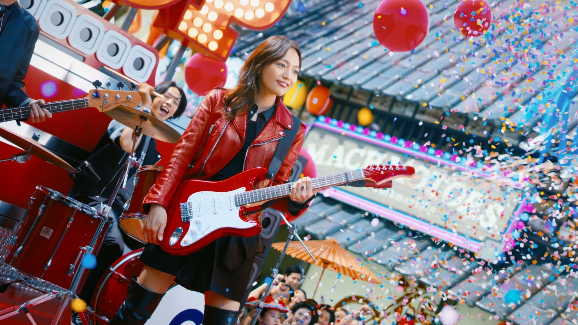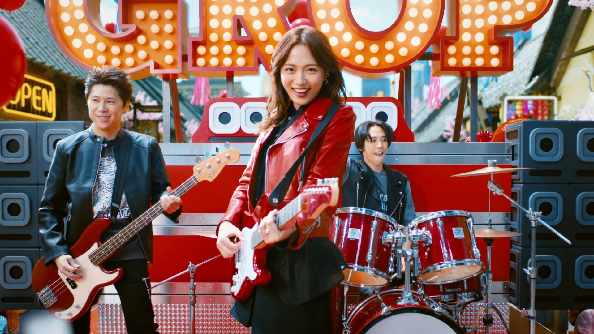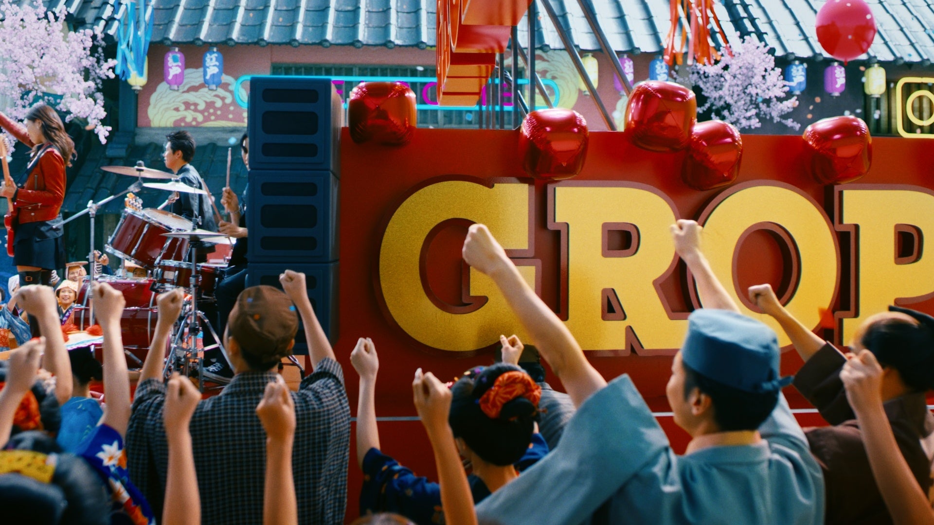 華やかな「NEO江戸」の街並みの中、川口さん率いるロックバンドが登場。ギターを手にした川口さんたちの演奏に合わせて、カラフルな衣装を身にまとった侍や町娘たちも、音楽に合わせて楽しげに踊り出します。楽しい雰囲気の中、悪代官がお祭りに割り込んできますが、臆することなくパフォーマンスを続ける川口さん。ギターの先端から紙吹雪も噴射され、お祭りはさらに盛り上がります。エネルギーや活気に満ち溢れる場に悪代官も飲まれ、最終的にはお祭りに加わり満面の笑みで楽しみます。お祭りは最高潮を迎え、最後に川口さんの「何でもアリだね、グロップ!」の一言で締めくくられます。