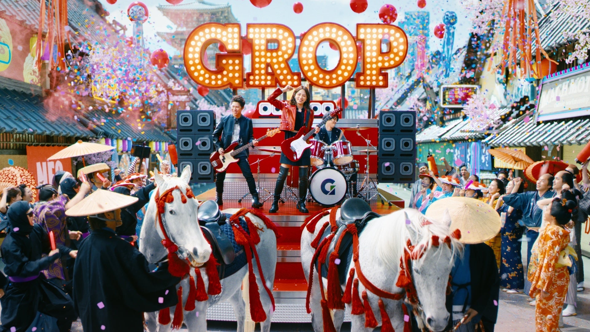 令和×江戸時代が融合した世界観で本物の馬&グロップ社員30人登場で大祝祭!俳優川口春奈さん率いるロックバンドが力強いエネルギーを表現 新TV-CM『グロップ NEO江戸』篇 6月6日(金) に放映開始