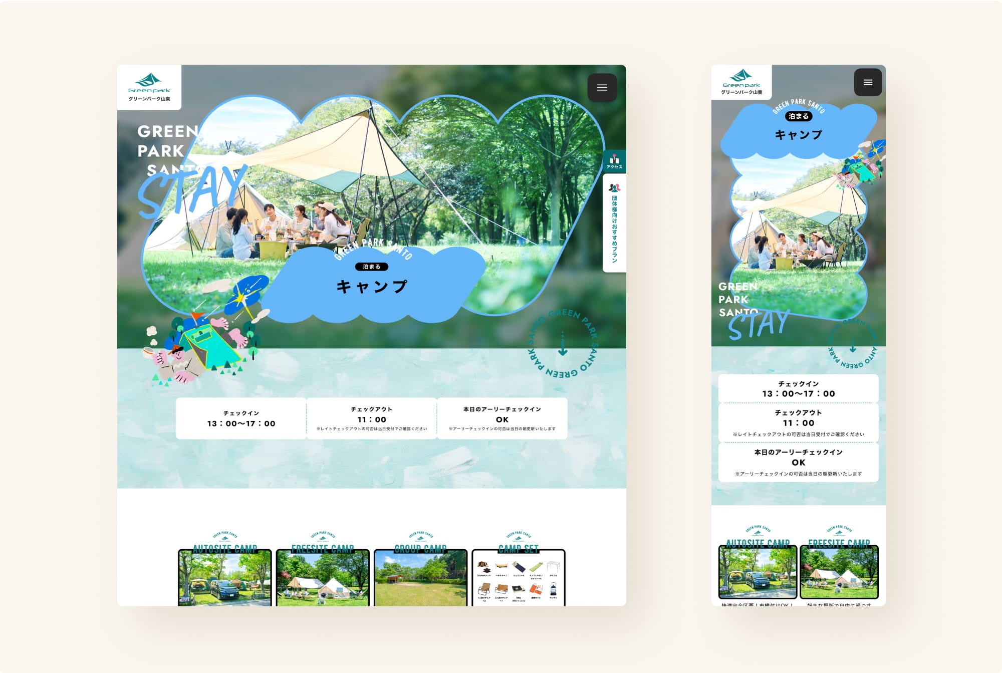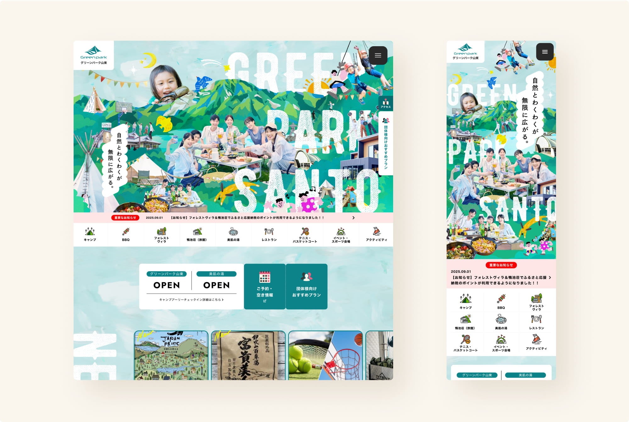「グリーンパーク山東」のWebサイトは、「自然とわくわくが無限に広がる!」をコンセプトに、20以上の施設が集まる複合公園を一目見ただけで「わくわく!」「楽しい!」と感じてもらうサイトを目指しました。ぜひ、実際にサイトを触って体感してみてください!