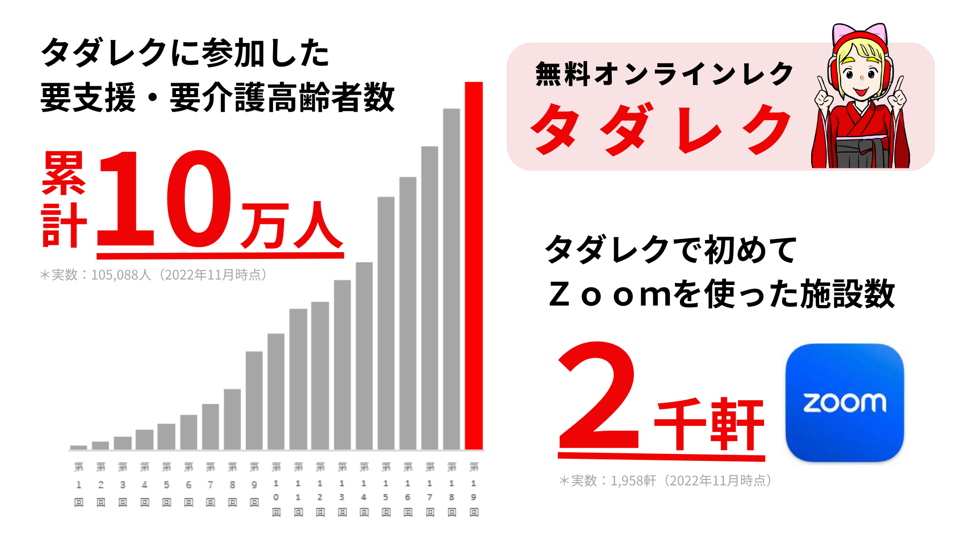 また、本非営利イベントは、IT活用が遅れている介護業界のIT化にも貢献しており、タダレクをきっかけに初めてZoomを使い始めた施設は、1,958施設に及びます(2022年11月時点)
