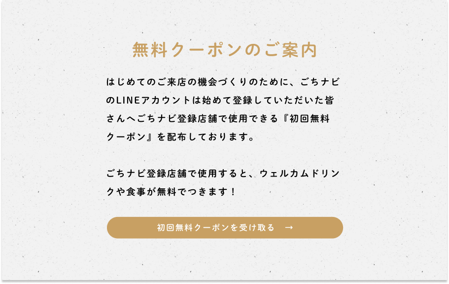 ごちナビでは、はじめてのご来店の機会づくりのために、ごちナビのLineアカウントを初めてご登録していただいたユーザーさまへ、ごちナビ加盟店舗で使用できる『初回無料クーポン』を配布しております。