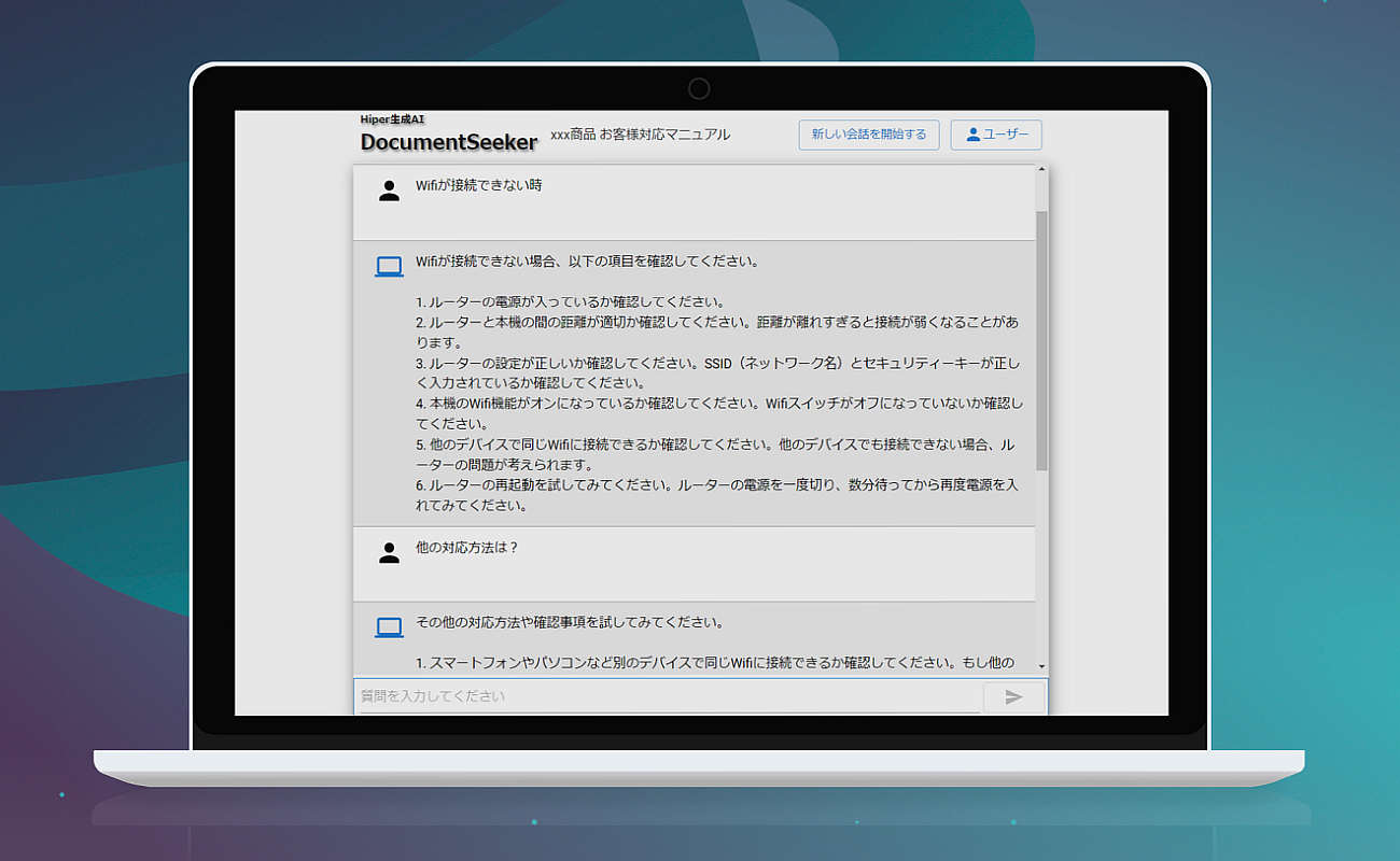製品マニュアルやトラブルシューティングのドキュメントをもとに、顧客からの質問に対して、リアルタイムに正確な回答を提示し、顧客満足度アップを図ります。