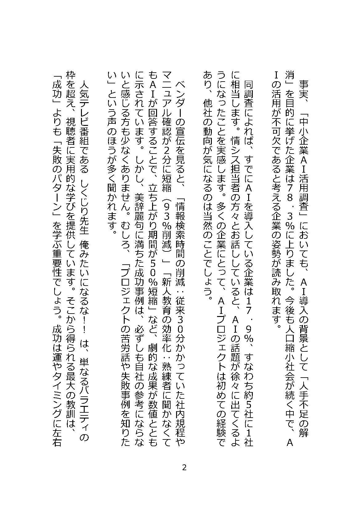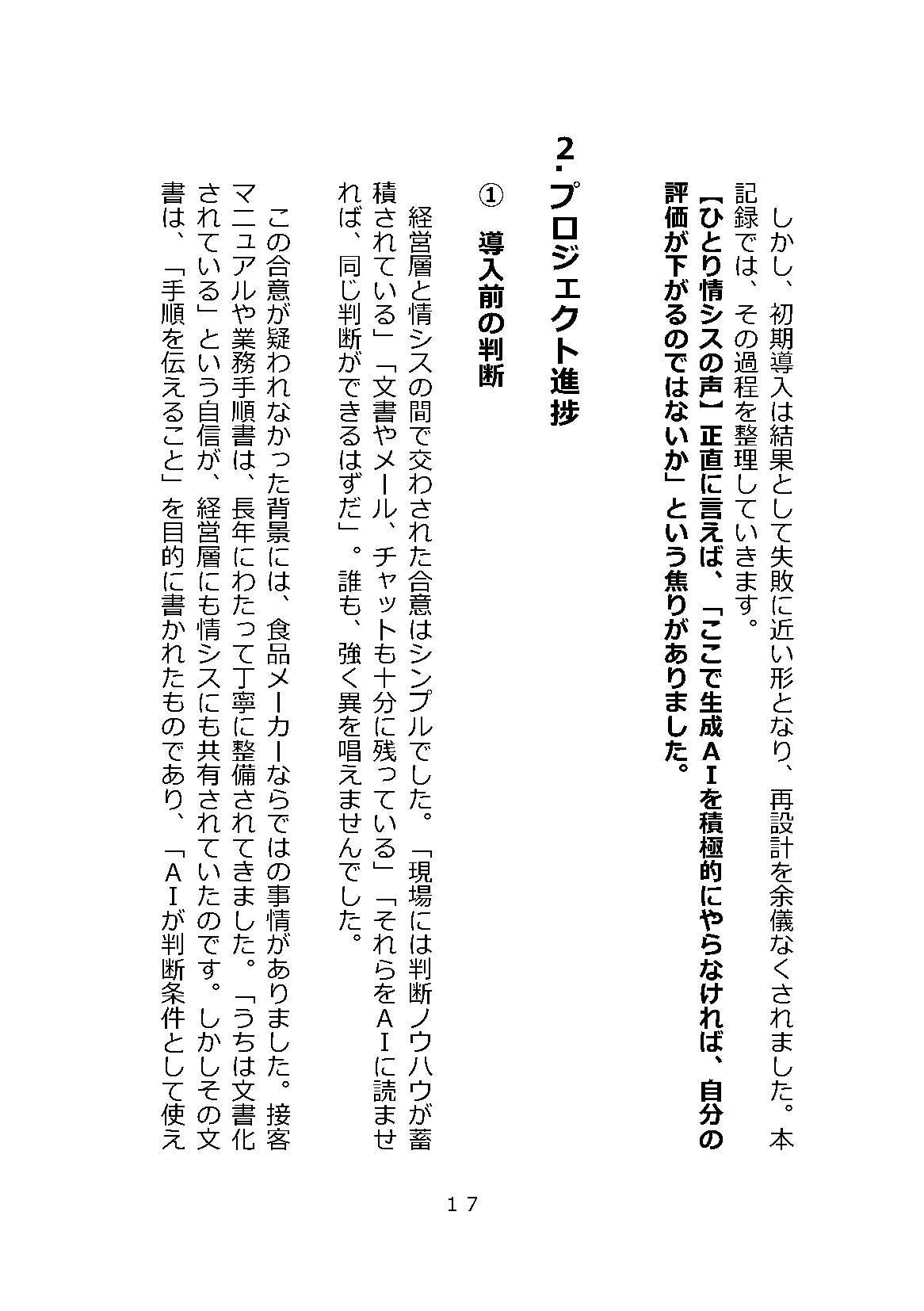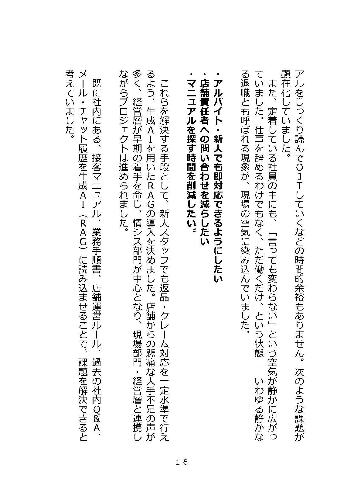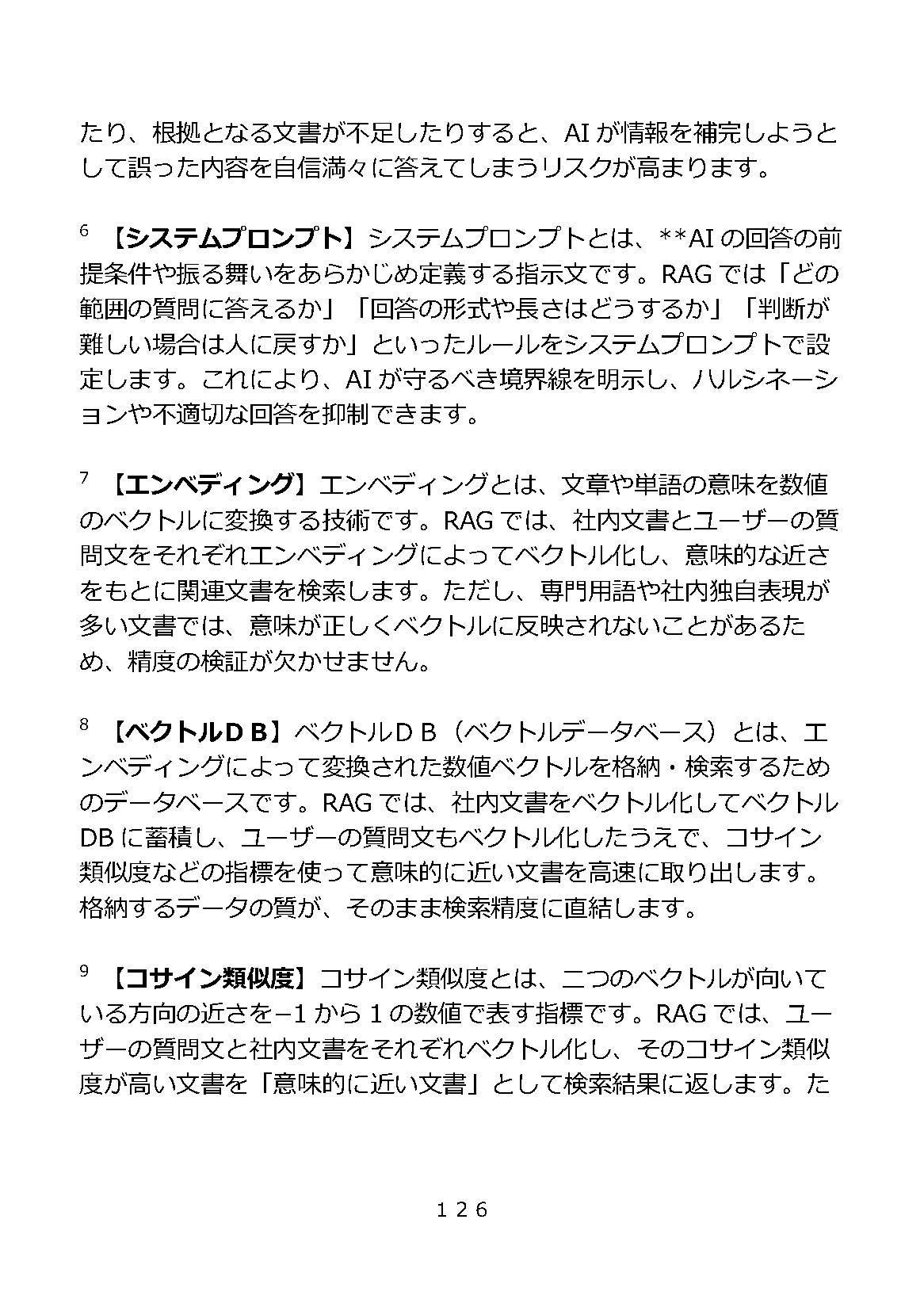 食品製造・販売企業(従業員180名)、卸売(140名)、製造(160名)、医療・介護(180名)、建設(85名)5業種の中堅中小企業で実際に生成AIのRAGを導入するプロジェクトの中でのしくじり(失敗)ポイント収録。どのように対処したか、現場への導入推進の流れなど、実際の業務シナリオに沿った構成になっています。