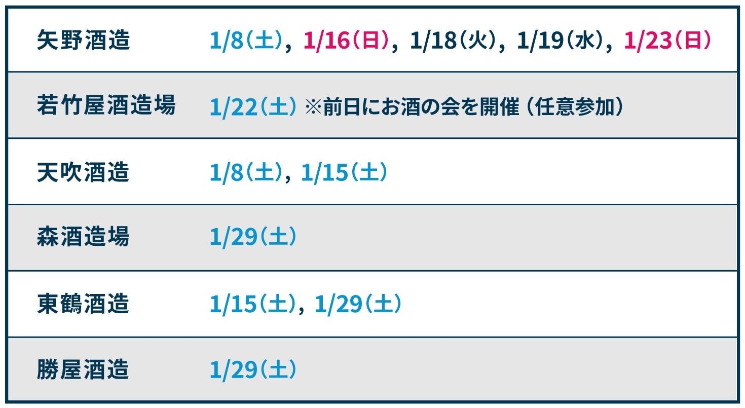 - 各酒蔵に集合(*早朝に酒蔵に集合していただきます。遠くにお住まいの方は前泊されることをお勧めします)