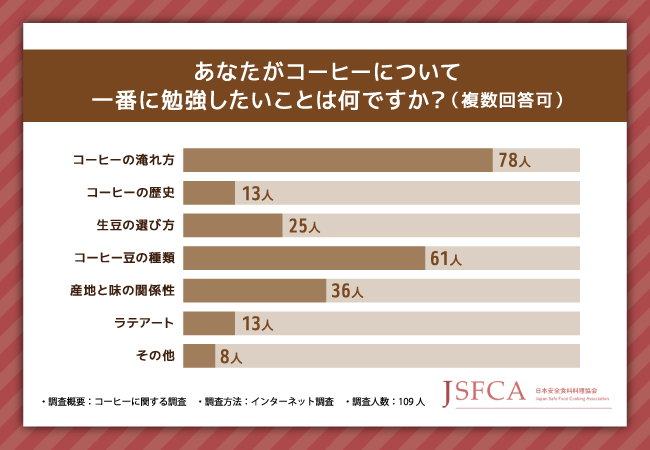 『コーヒーの淹れ方』が78人と最も多く、次いで『コーヒー豆の種類』が61人、『産地と味の関係性』が36人、『生豆の選び方』が25人、『コーヒーの歴史』と『ラテアート』が13人、その他が8人という結果となりました。