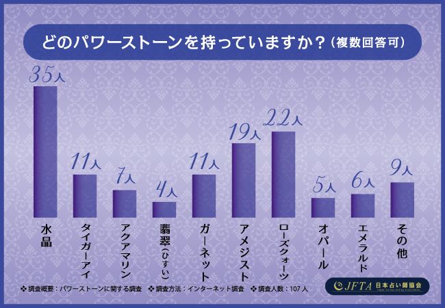 『水晶』(35人)が一番多く、次いで『ローズクォーツ』(22人)、『アメジスト』(19人)、『ガーネット』『タイガーアイ』(11人)、『その他』(9人)、『アクアマリン』(7人)、『エメラルド』(6人)、『オパール』(5人)、『翡翠(ひすい)』(4人)