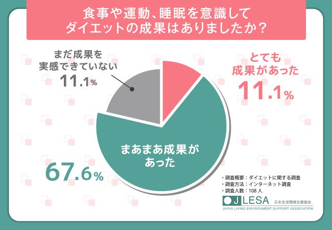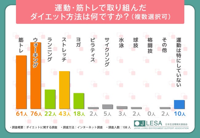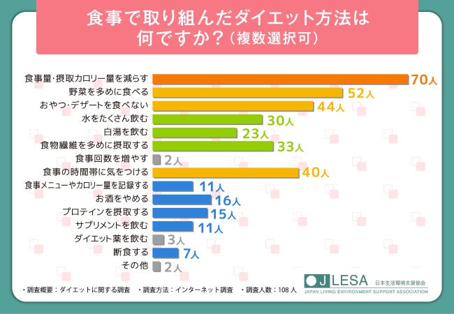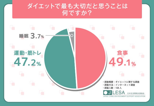 そこで今回、ダイエットアドバイザー資格検定(https://www.nihonsupport.org/biyoshikaku/diet/)を主催する日本生活環境支援協会(https://www.nihonsupport.org/)は、ダイエットをする全国の男女108人を対象に「ダイエット」に関する調査を行いました。