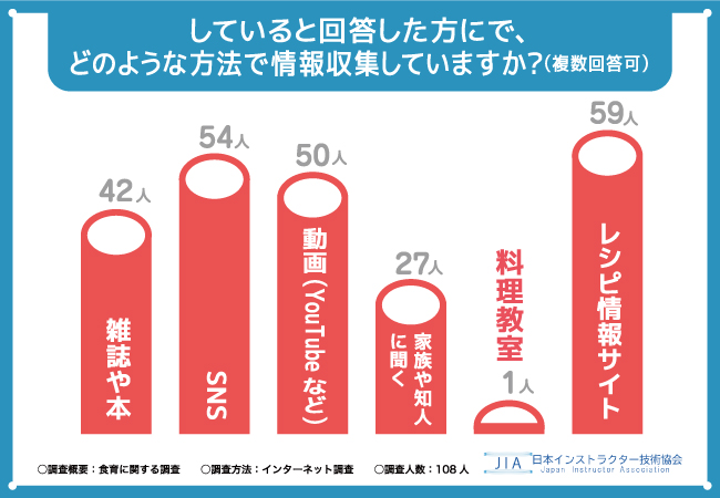 食事や栄養について情報収集をしていると回答した方に、「どのような方法で情報収集していますか? 」と質問をしたところ、『レシピ情報サイト』(59人)が一番多く、『SNS』(54人)、『動画(YouTubeなど)』(50人)と上位3つがWeb情報、次いで『雑誌や本』(42人)、『家族や知人に聞く』(27人)、『料理教室』(1人)という結果になりました。