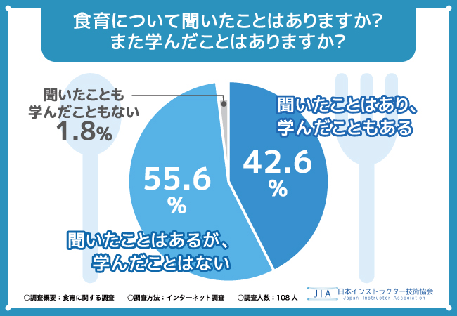 そこで、JIA日本インストラクター技術協会(https://www.jpinstructor.org/)は、全国のお子さんを持つ親御さん108名を対象に、食育についての意識調査を実施しました。