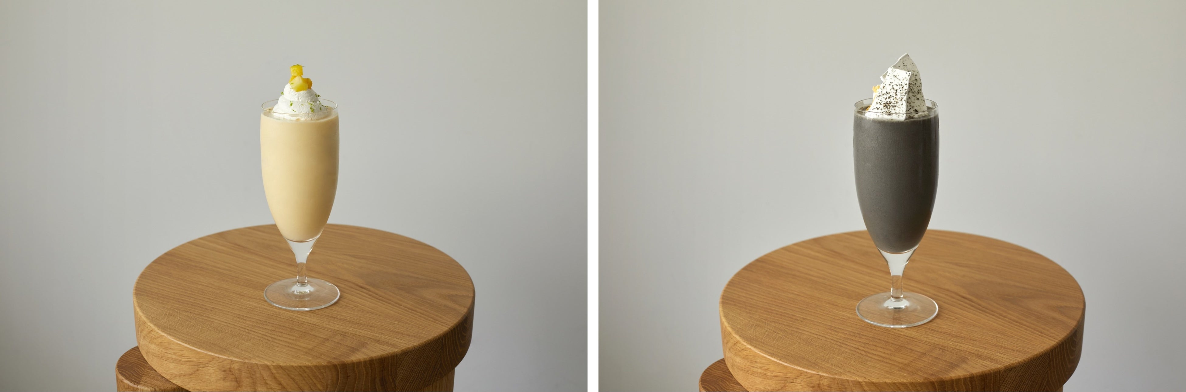 夏のシェイクは白ごまとバニラアイスをベースに、ココナッツミルクとパイナップルをミックス、仕上げにライムをふりかけた爽やかな一杯。