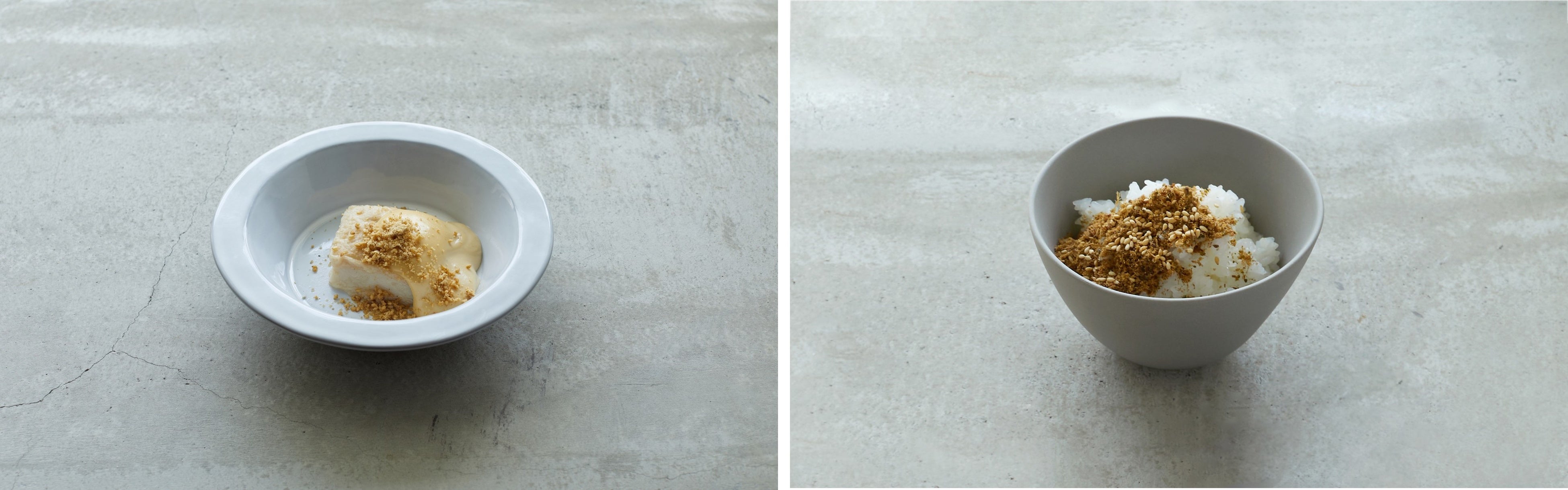 そうめんで使用したマグロ節に、煎りごまと七味を混ぜた特製ふりかけでかけてお召し上がりいただけます。魚介の旨味、ごまの香りを七味がピリッと引き締めます。ふりかけ一つでご飯が何杯も食べられる隠れた名メニューです。