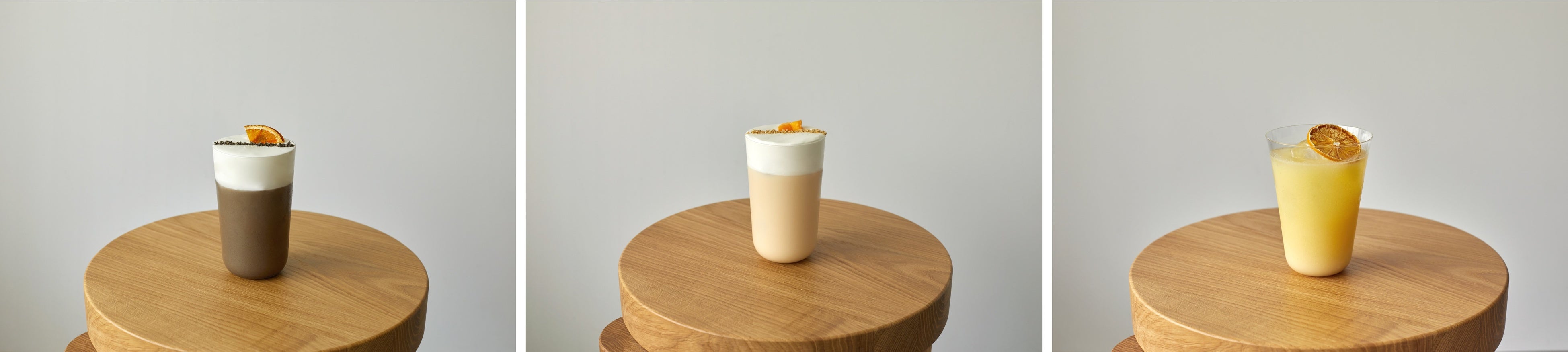 黒ごまとオーツミルクをベースにしたラテは、メープルのやさしい甘みと、最後に香るオレンジが後を引く大人な一杯。 ※写真はアイスになります。
