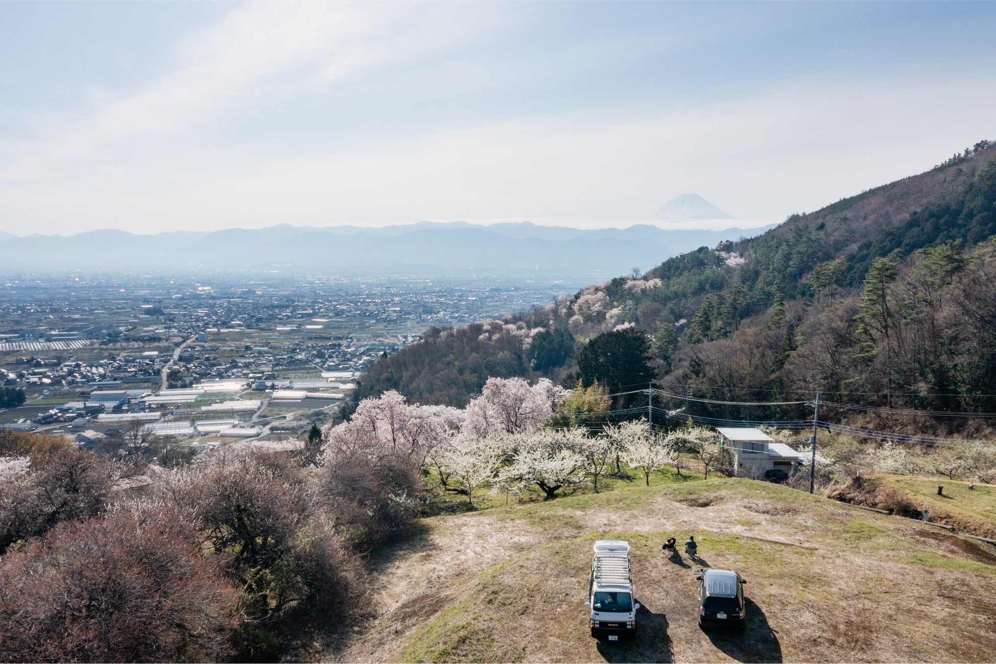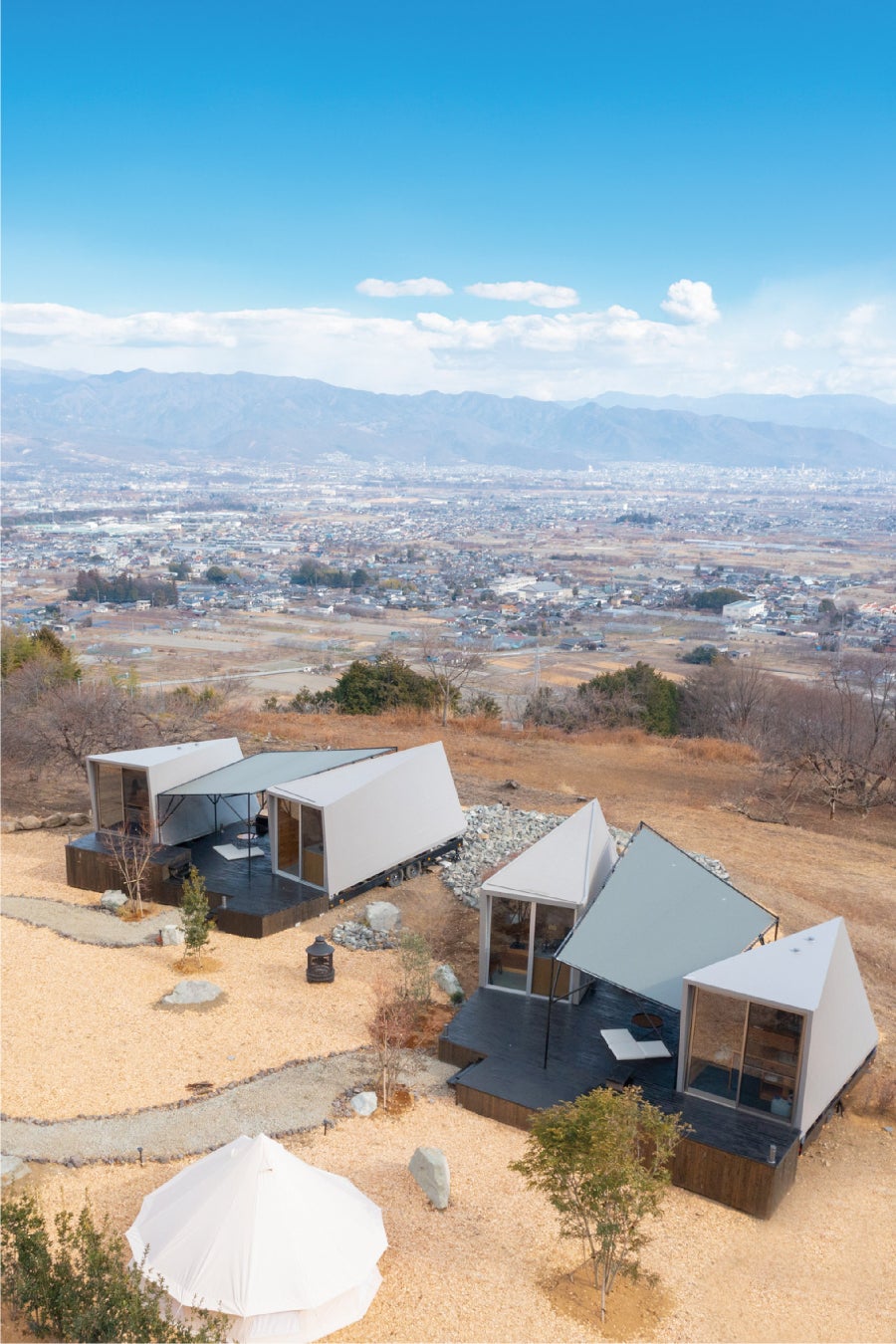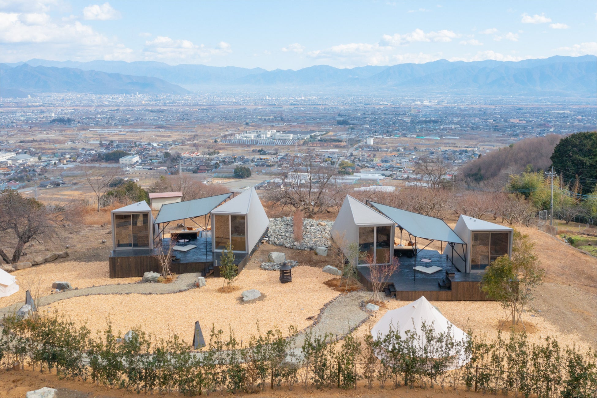 元々は「築山広場」と呼ばれる南アルプス市が所有する土地は、甲府盆地を一望でき、富士山も望める、知る人ぞ知る隠れ家的な「桜の名所」として地元の方などで愛されてきました。一方で絶景を擁するロケーションでありながらも、桜の名所以外としての利活用がされていない現状課題に、地域活性に何か貢献できないかと、地元企業の株式会社GATESが株式会社CountryWorksと共に立ち上がりました。株式会社GATESが南アルプス市から土地を借り受け、株式会社CountryWorksがプロデュースするアウトドア型宿泊施設ブランド「TENAR(テナール)」のキャビンを活用した、1日2組限定の宿「ALPS LAPS withTENAR」が誕生しました。