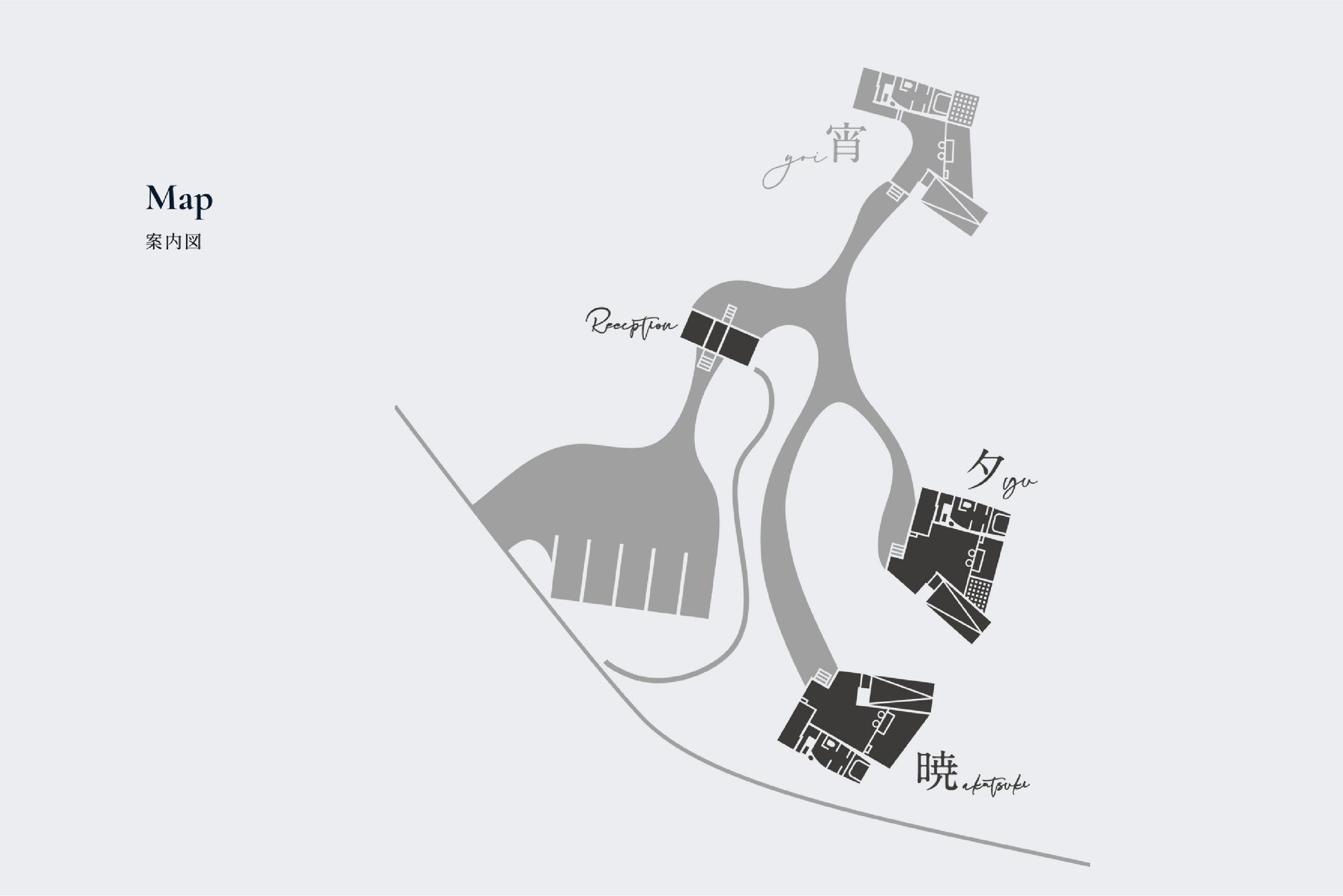 施設構成:寝室棟、露天風呂棟、ウッドデッキから構成される客室3室(宵、夕、暁)