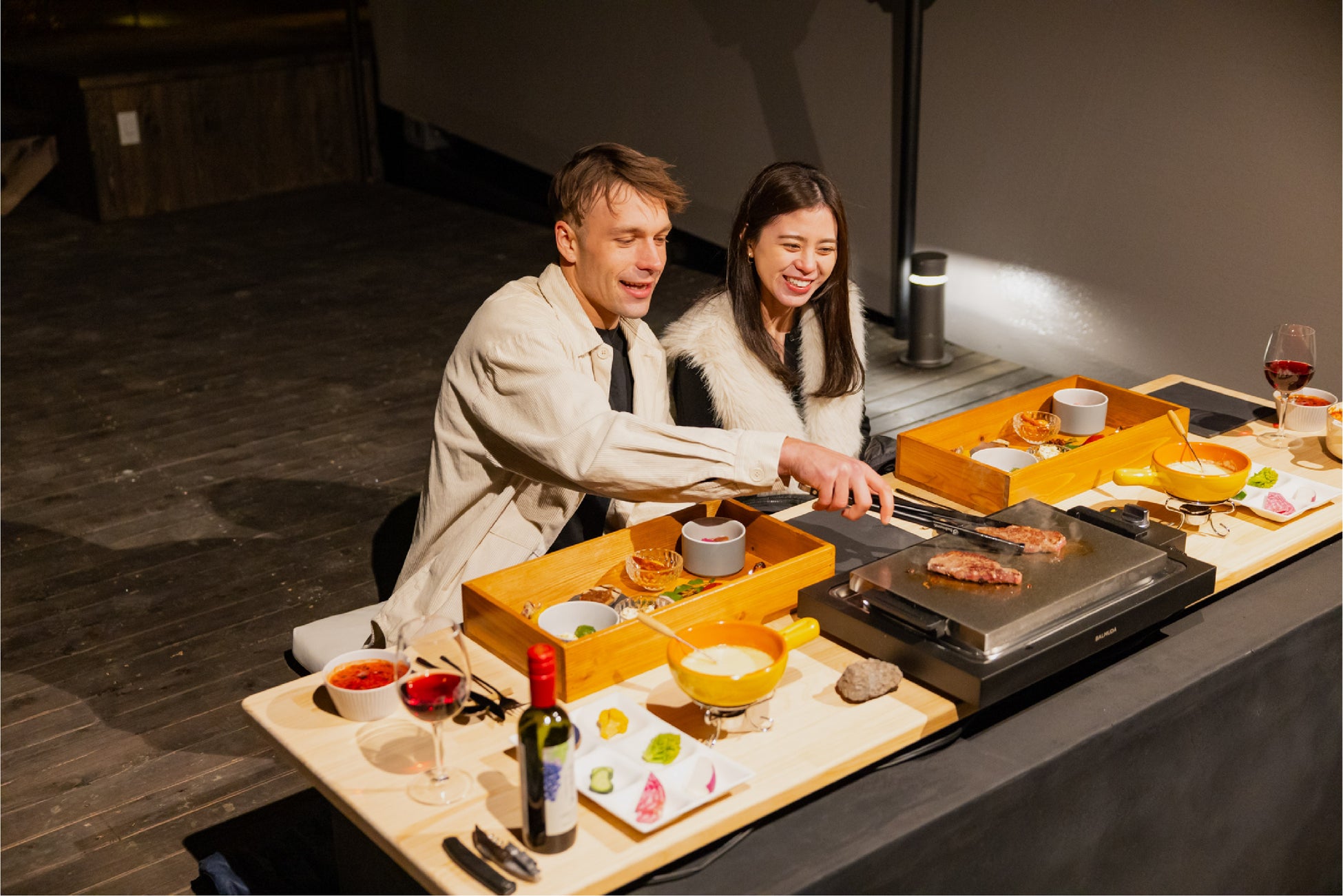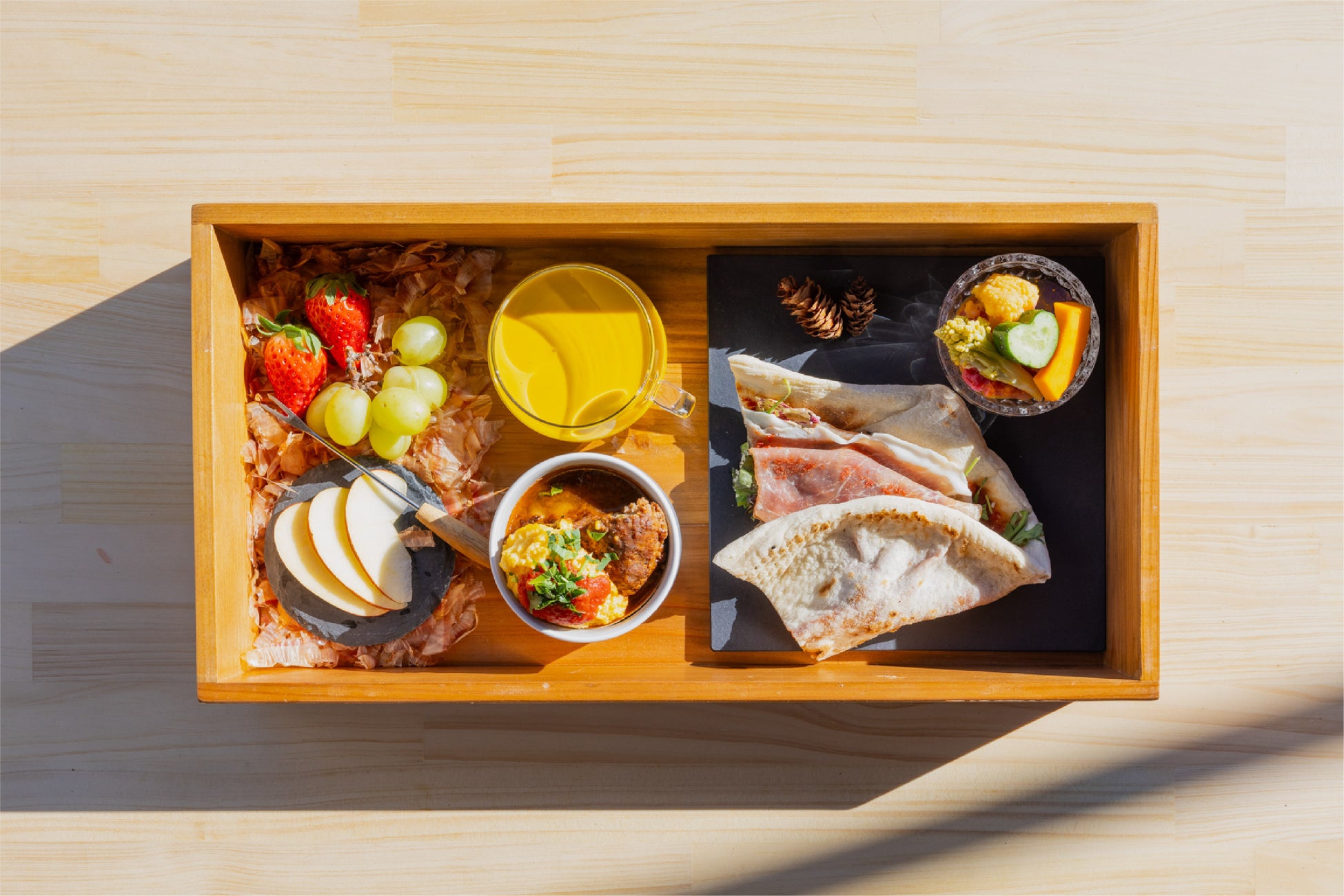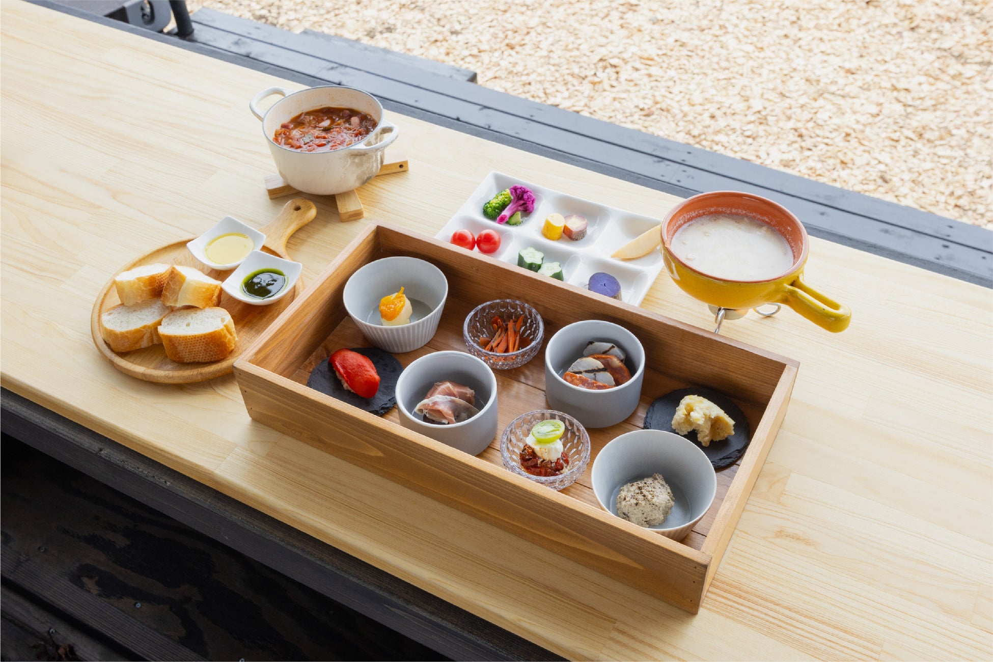 山梨県甲府市のイタリアンレストラン「山梨レストラン メリメロ(meli-melo)」と提携し、「ALPS LAPS withTENAR」専用のディナーボックスや朝食ボックスをご用意。ケータリングで山梨県産の食材をふんだんに使用したディナーコース料理のお食事(スープ、オードブル、チーズフォンデュ、メイン、デザートの5品)やこだわりの朝食を、絶景を眺めながらお楽しみいただけます。※冬期は寒さ対策のため、お食事の場所をプライベートテント内かウッドデッキかいずれかをお選びいただきます。