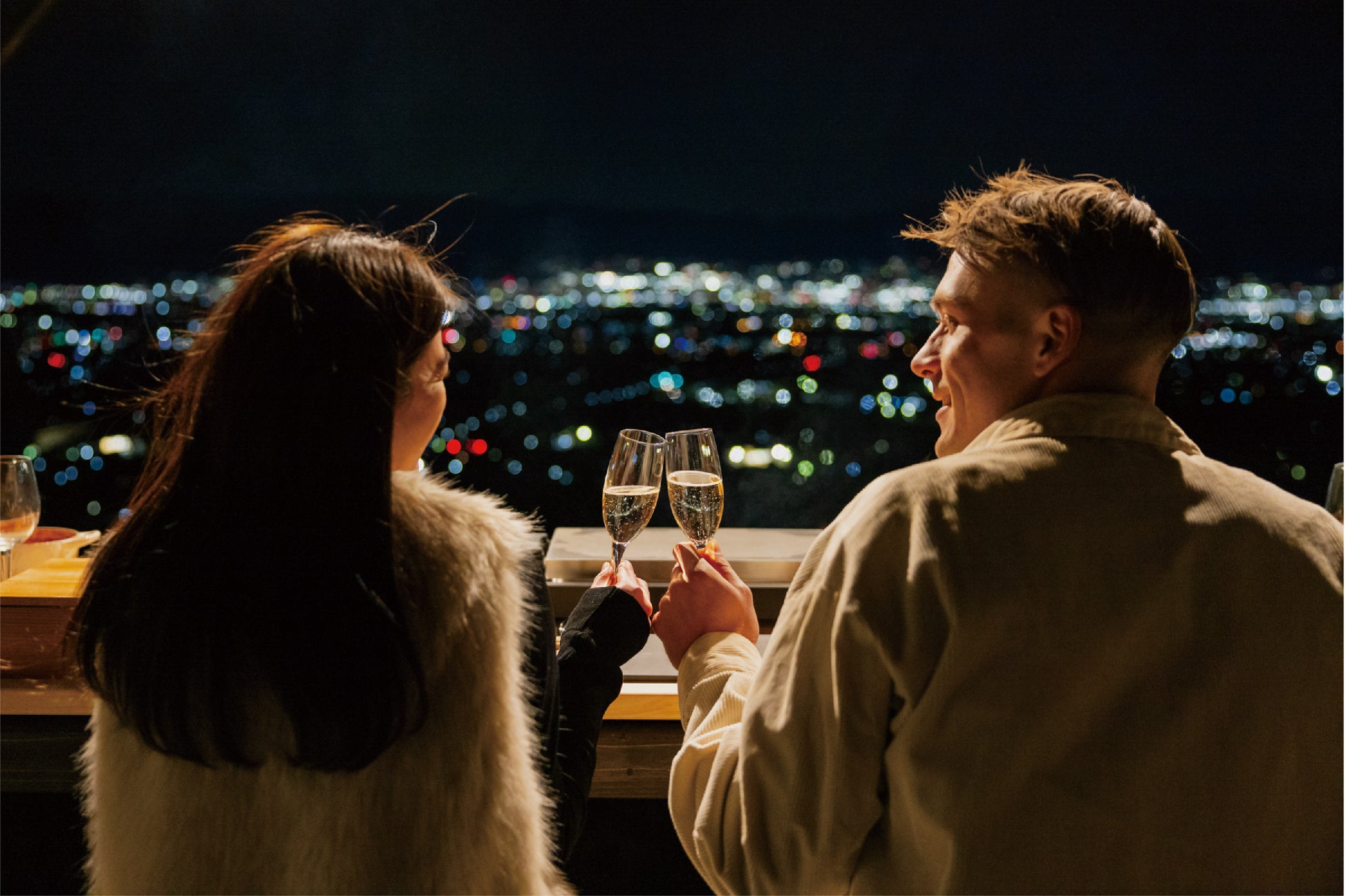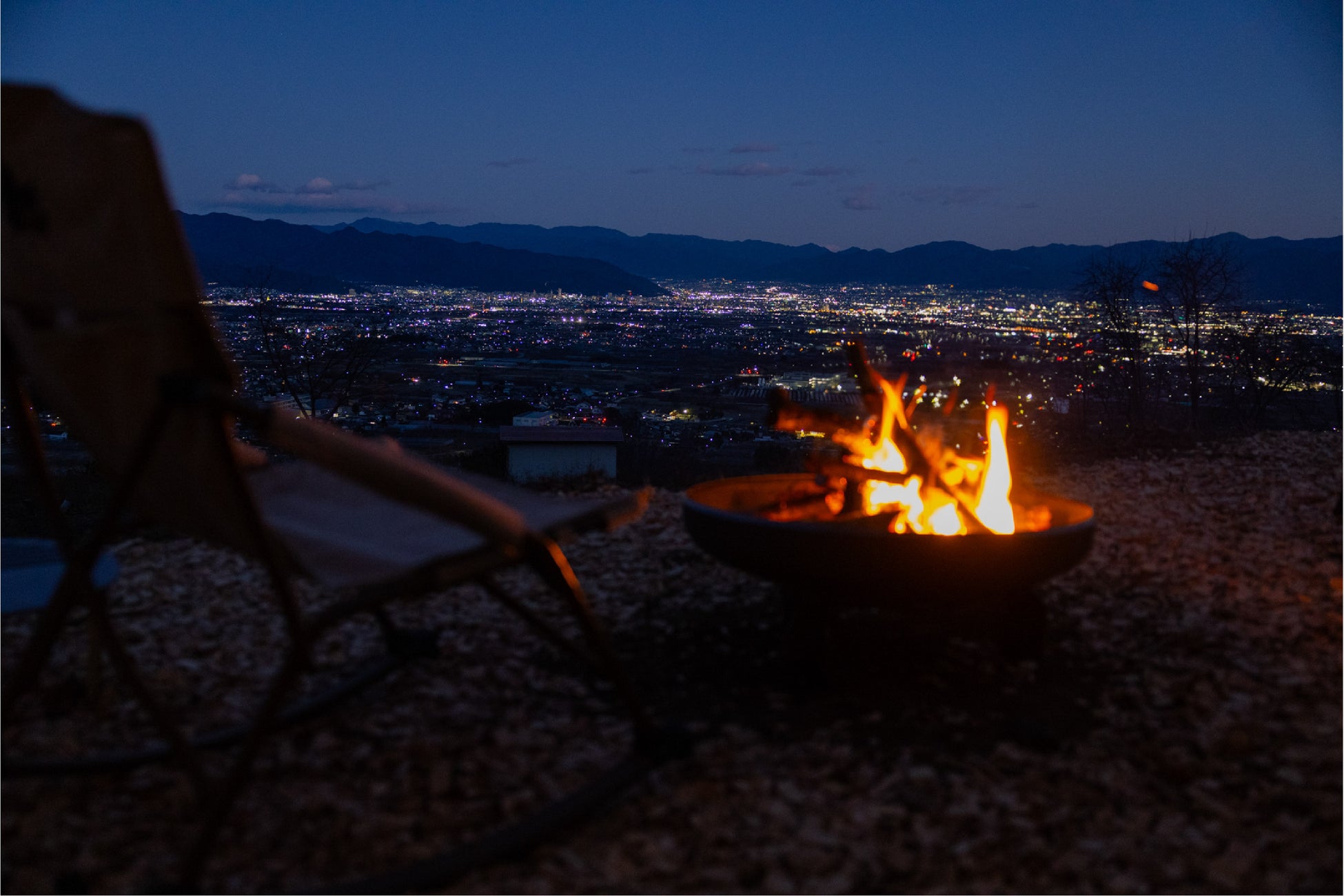 甲府盆地との約300mの高低差による標高545mからの眺望は絶景で、圧倒的ロケーションから眺める景色は、日中~夕暮れ~夜景~星空~夜明け前~朝焼け、と変化していきます。