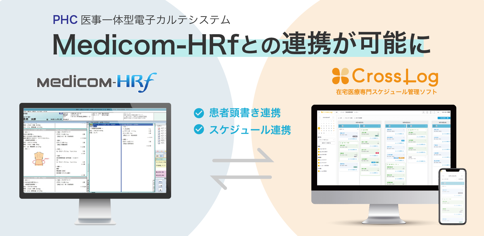 在宅医療専用スケジュール管理ソフト「CrossLog」を運営するクロスログ株式会社(本社:福岡県福岡市、代表取締役:宮原智新)は、PHC株式会社(本社:東京都港区、代表取締役社長:森本 恭史)が提供する電子カルテシステム「Medicom-HRf」とシステム連携を実現いたしました。
