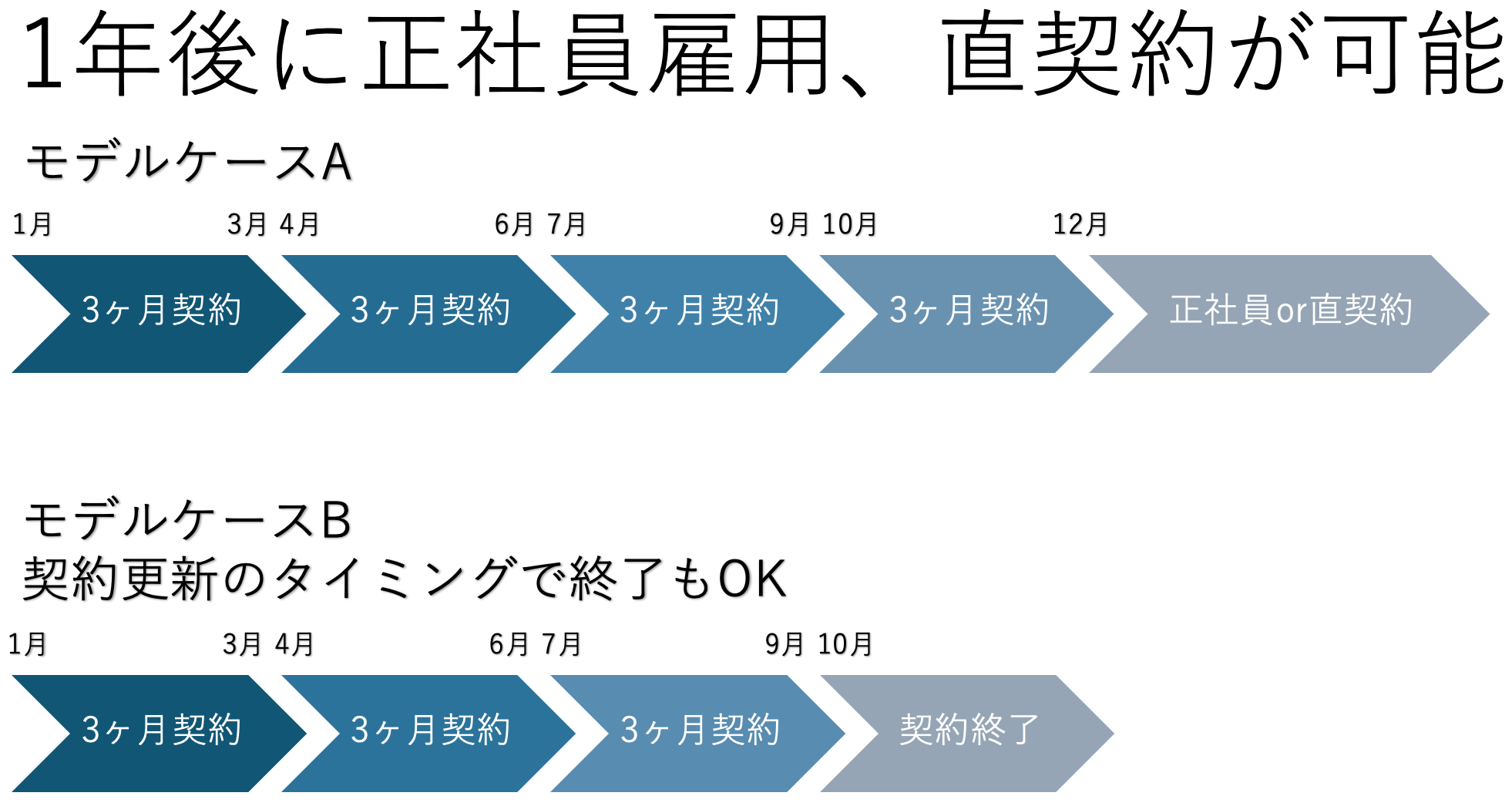 最初の1年間は1ヶ月や3ヶ月ごとに契約更新していくことになりますが、エンジニア様、企業様ともに将来的に長期間に渡って何らかの形で関わっていくかの見極め期間としてご利用ください。
