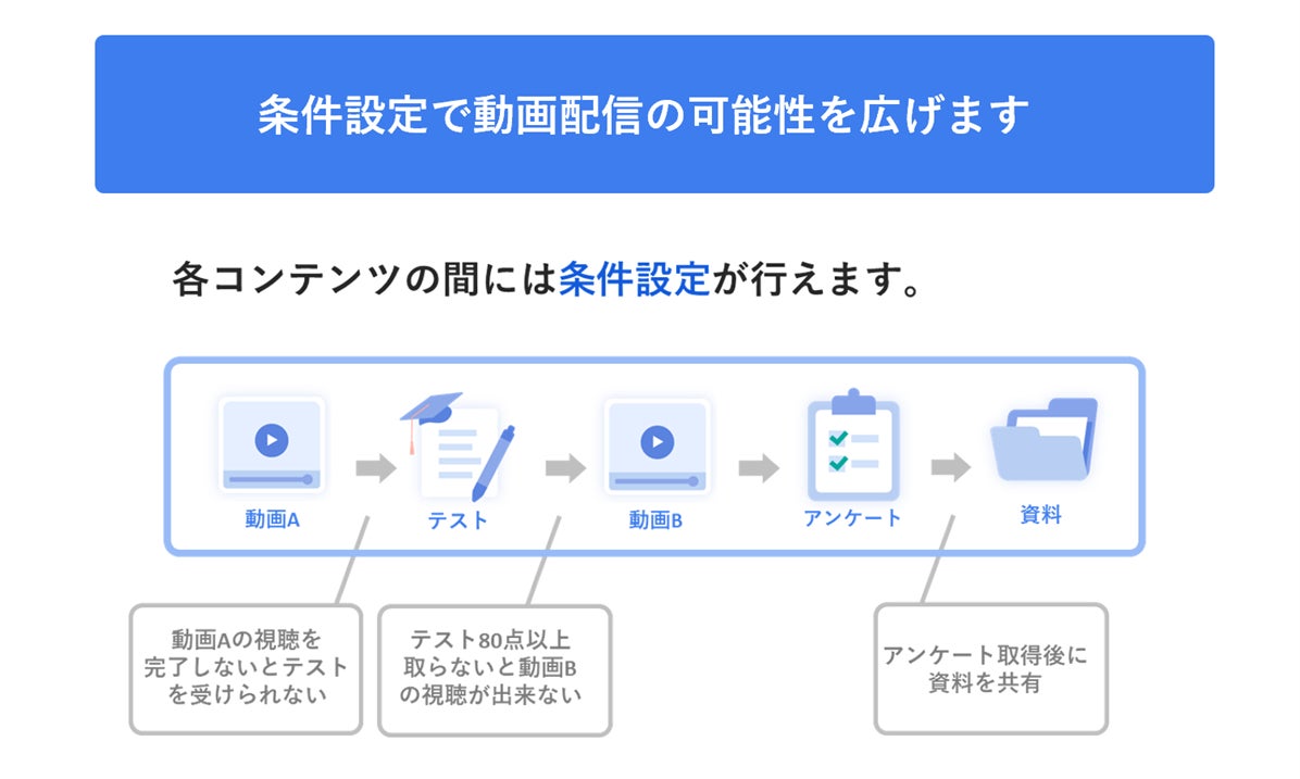 各コンテンツ間には「動画を最後まで視聴しないとテストに進めない」などの条件指定ができるため、理解度アップや視聴者からの情報取得をより強化することができます。