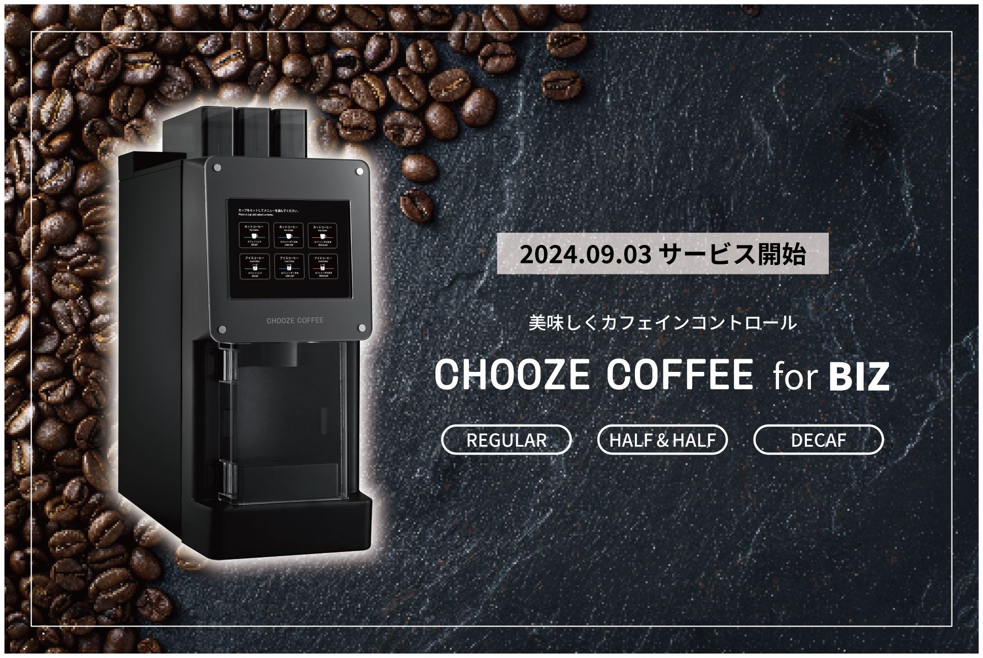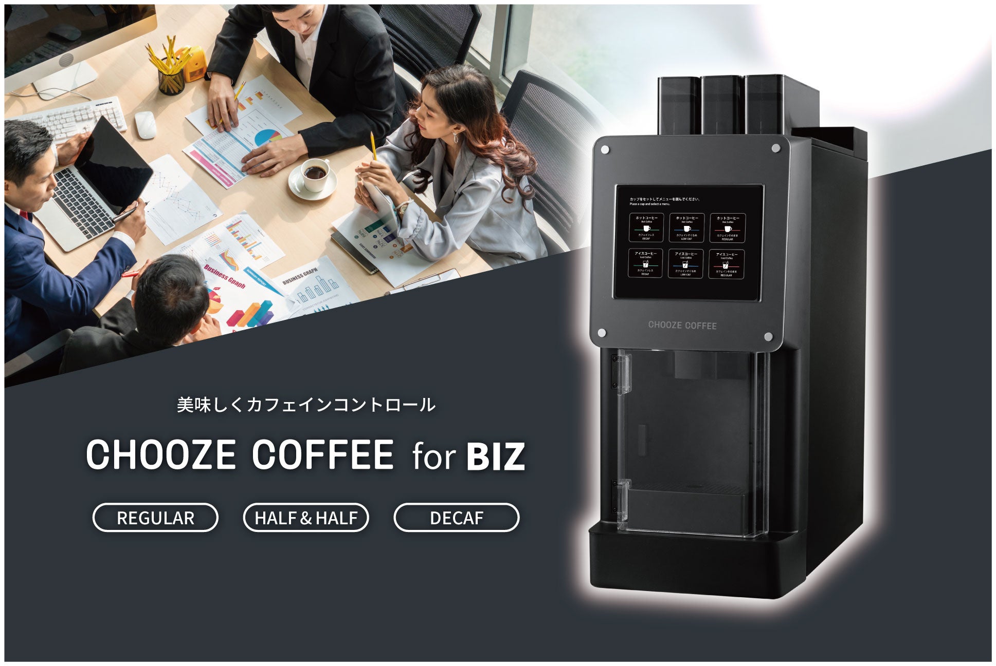 2024年9月3日(火)から、企業向けに、ホテルやオフィス、コワーキングスペースやショールームなどで、「カフェインコントロール」しながら、美味しいコーヒーが飲める「CHOOZE COFFEE for BIZ」を提供開始します。専用のコーヒーマシンを導入するだけで、関係者の体調管理はもちろん、睡眠の質や生産性向上を実現し、健康経営を推進いただけます。