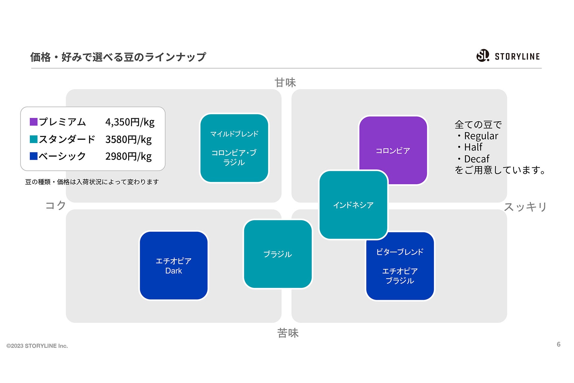 自社製造のZEN Craft Decaf Coffee™️をはじめ、世界の産地から厳選したコーヒーをお届けします。価格帯は、プレミアム(4,350円/kg)、スタンダード(3,580円/kg)、ベーシック(2980円/kg)の3種類から選択でき、今後、お好みの味や産地、焙煎度で選べるラインナップの充実も予定しています。