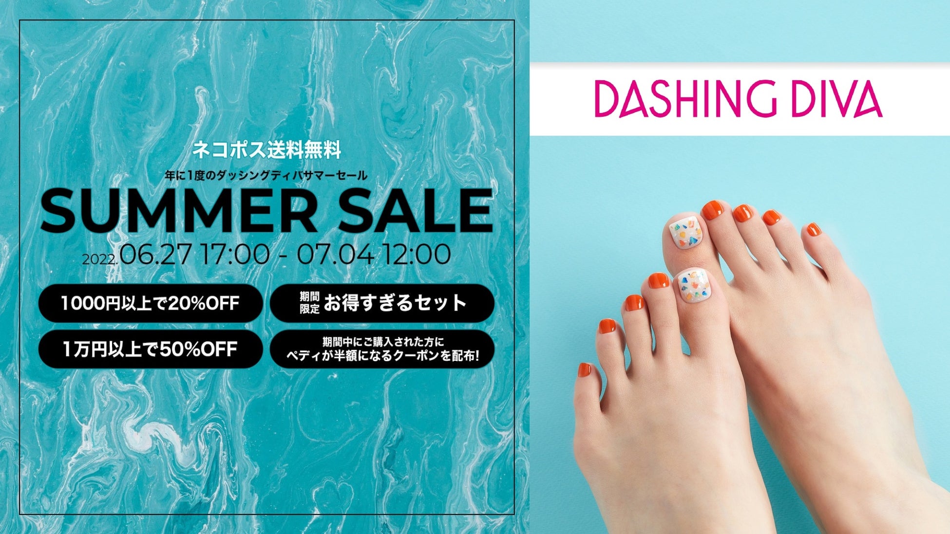 「貼るだけ、簡単ジェルネイル」を実現し、キレイを目指す全ての人に寄り添うネイルブランド “DASHING DIVA(ダッシングディバ)”は、この度、2022年6月27日(金)17:00〜7月4日(金)12:00までの1週間、大変お得な値段で買える、年に一度のSUMMER SALEをブランドEC(https://www.dashingdivashop.co.jp/html/page65.html)にて開催いたします。