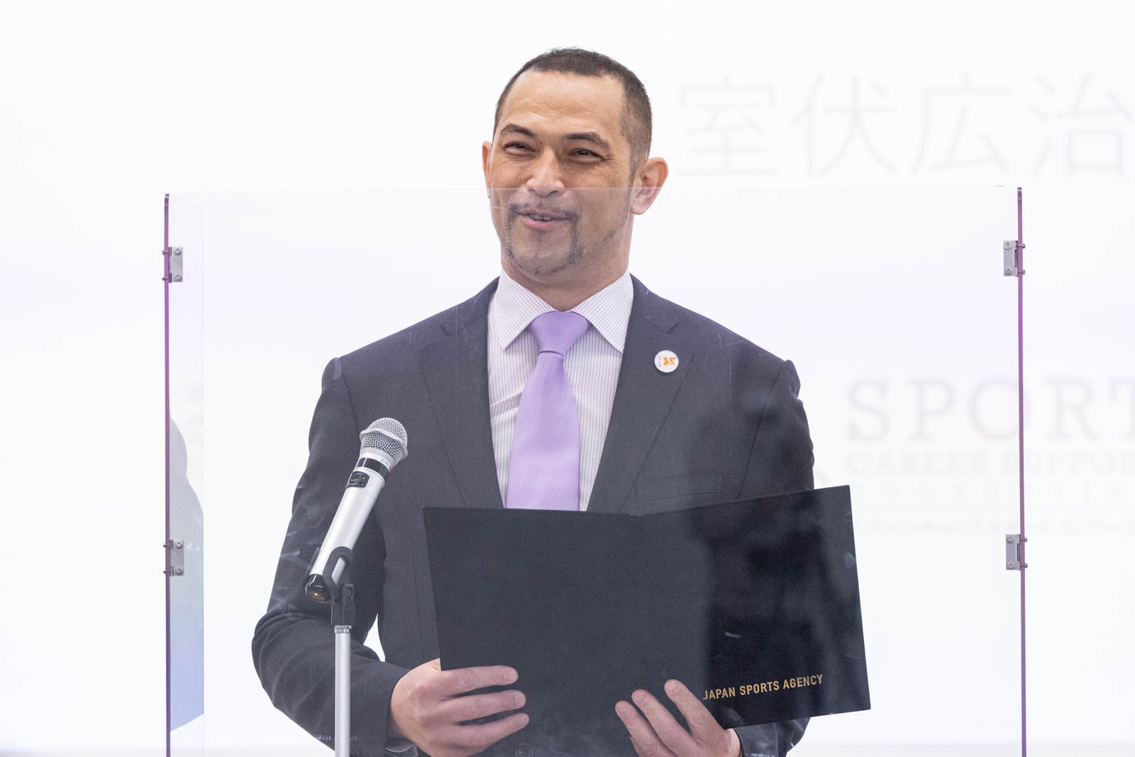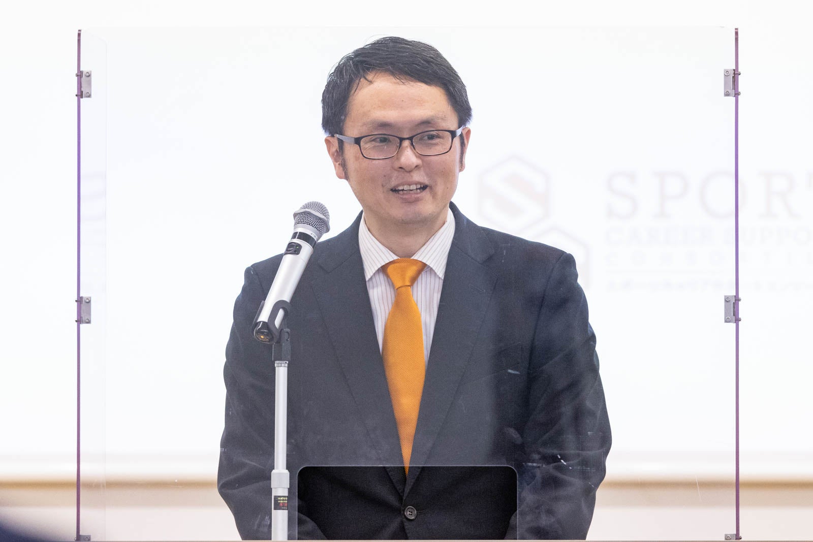 次にスポーツ庁室伏広治長官が「スポーツキャリアサポート支援事業」について説明をしました。室伏長官は「アスリートのキャリア全体を見据えたサポートができる指導者不足等の課題に対して、コンソーシアム加盟団体と連携し、アスリートが引退後の社会で競技を通じて培った能力を存分に発揮できるようサポートを充実させていきたい」ということを伝えました。
