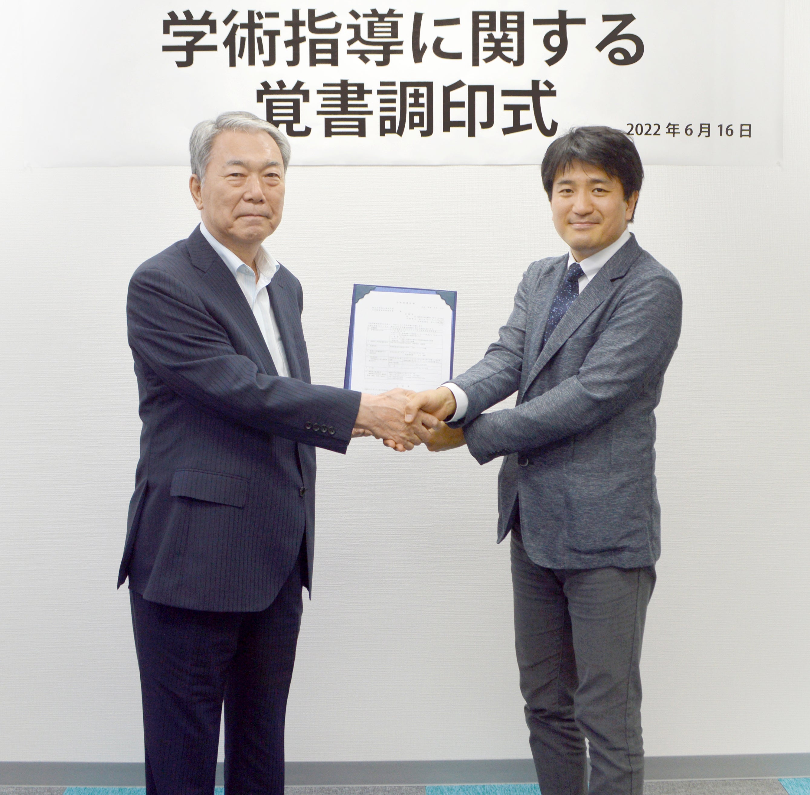写真は2022年6月16日の調印式の様子(左:アネムHD肥川社長 右:東京大学新藤准教授)