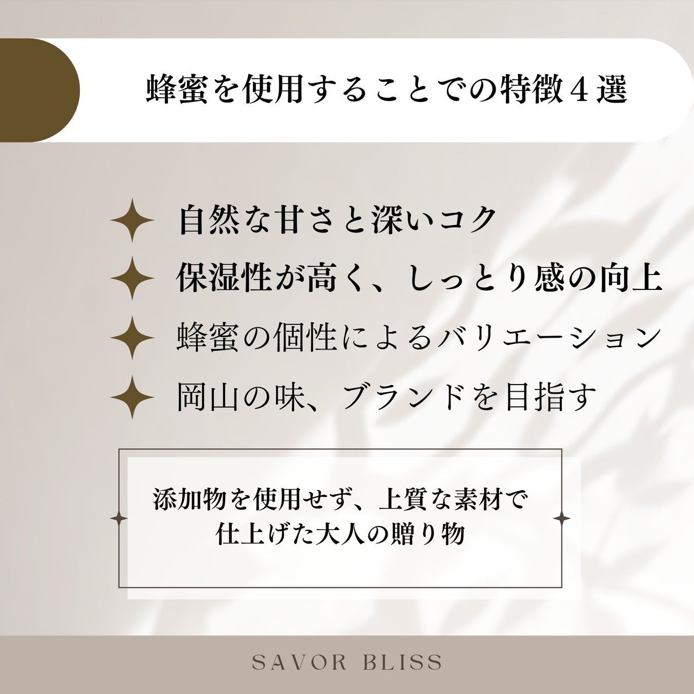 わたしたちが開発した「Honeyブランデーケーキ」は、岡山の上質な蜂蜜を使用し、さらに上質なブランデーをたっぷりと浸み込ませ、しっとりとした食感と豊かな香りを実現しました。