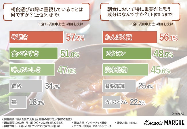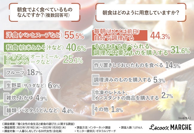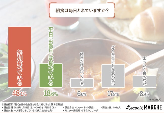 そこで今回、忙しい日々にも美味しくて栄養満点な食事をお届けする『LACOOK MARCHE(ラコックマルシェ)』(https://lacookmarche.com/shop)を運営する株式会社オモヤは、一人暮らしをしている30代女性を対象に、「働く女性の食生活と朝食の選び方」についての調査を実施しました。