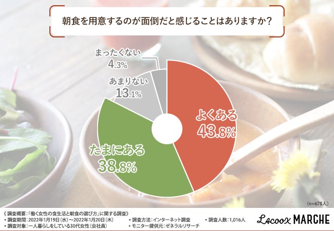 そこで、「朝食を用意するのが面倒だと感じることはありますか?」と尋ねたところ、『よくある(43.8%)』『たまにある(38.8%)』と、8割近くの方が朝食の準備を面倒に感じていることが分かりました。