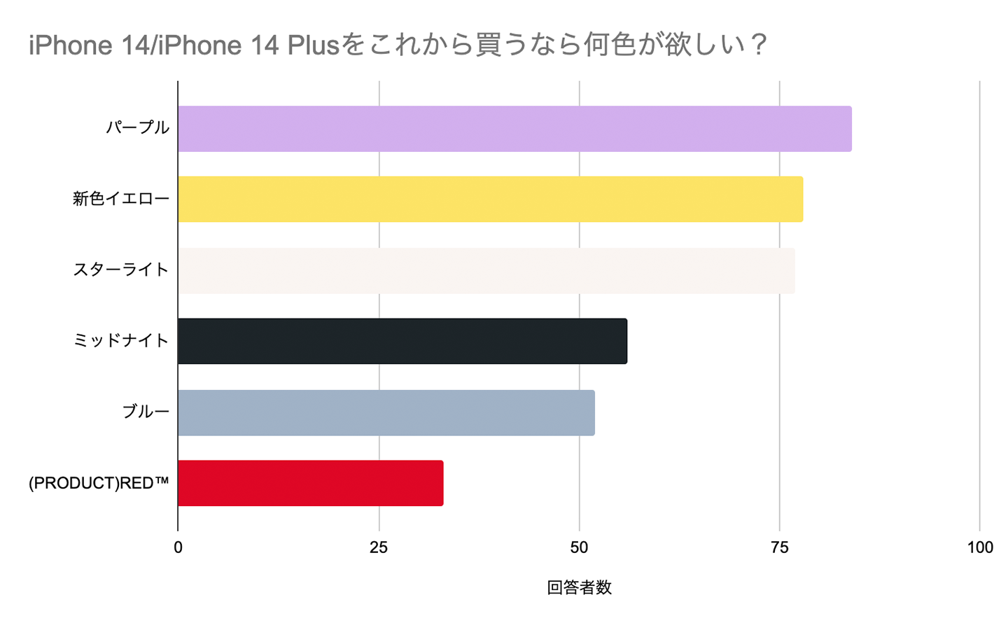 2023年3月に追加発表された新色イエローを選択したユーザーは約20.5%(78人が回答)となり、iPhone 14とiPhone 14 Plusのカラーバリエーションのうち2番目の人気となりました。