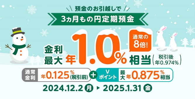 円預金残高を増額いただいた方に、3ヵ月間の円定期預金の金利が最大で年1.0%(税引後 年0.974%)相当になるようにVポイントをプレゼントします。