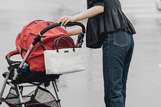 マジックテープでベビーカーの持ち手に取りつけられるマルチバッグ。