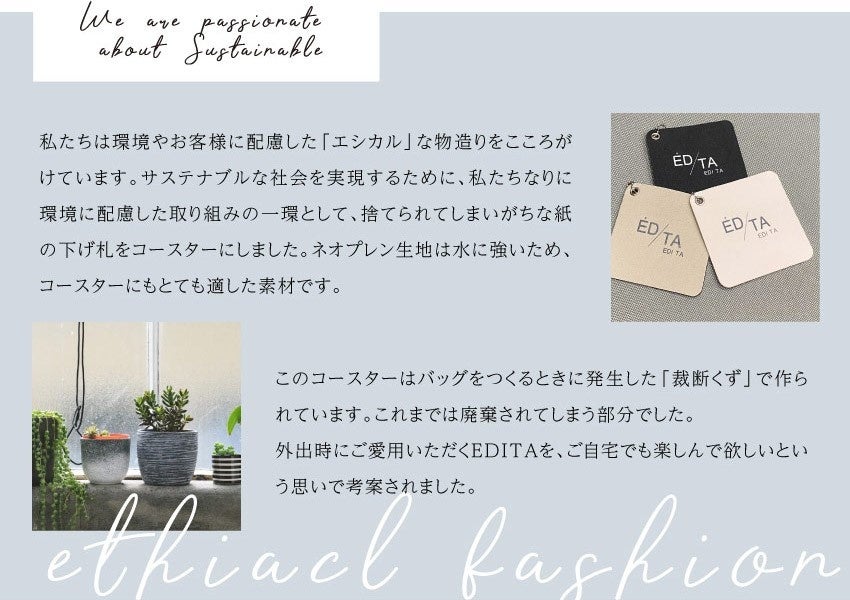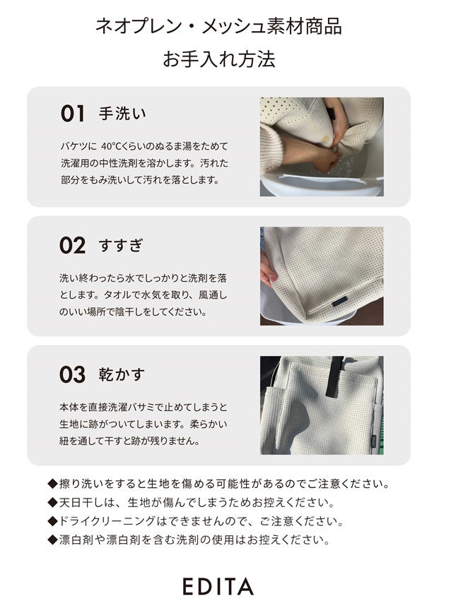 新型のウイルスが世界的に流行し、様々な新しい生活様式が生まれていく中、私たちにも何か世の中の為に役立てる事はないかと模索したところ、衣類やマスクを洗濯する事と同様にバッグも洗う事は出来ないかと考えました。そこで、水と相性のいい「ウェットスーツ」に使用する「ネオプレン生地」と、「ランニングシューズ」に使用する「メッシュ生地」を軸にEDITA(エディータ)を展開する事を決定しました。当ブランドでは、電車やバス、飲食店、職場などの外気に常に触れている日常使いのバッグを、「洗う」という新しい価値として提案しています。