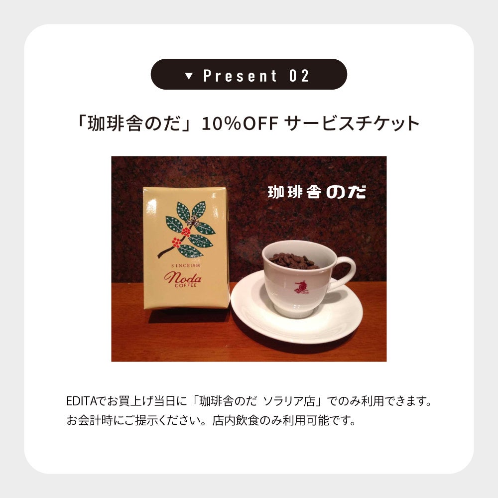税込1万円以上購入のお客様全員に、珈琲舎のだソラリアプラザ店で使用出来る10%OFFクーポンをプレゼントいたします。