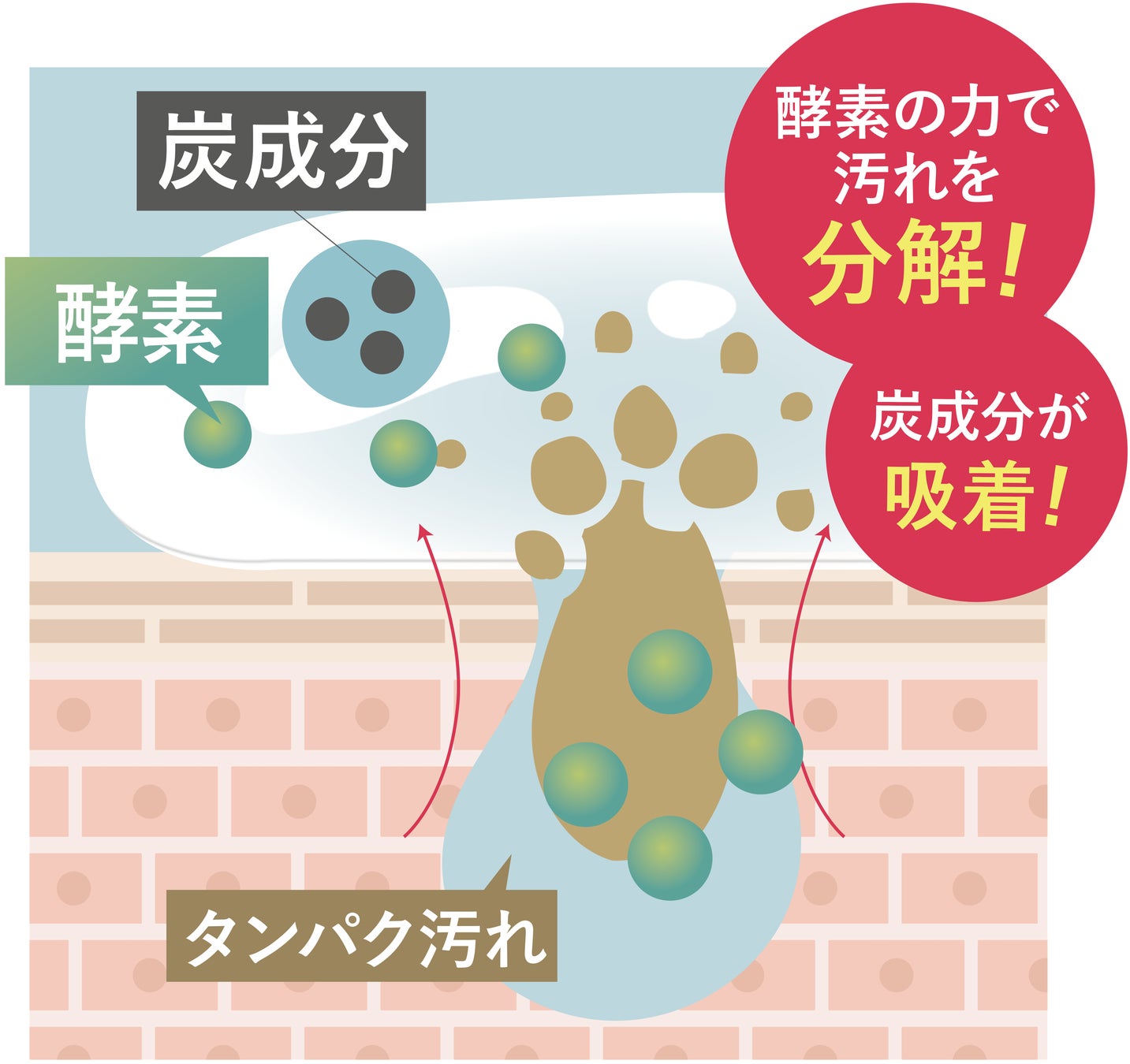 タンパク質7割と皮脂3割でできている角栓には、タンパク質を分解する「酵素」が効果抜群とされています。その「酵素」がタンパク汚れを分解し、吸着力の高い「炭」が浮き上がった汚れをしっかり吸い出します。肌に優しい植物由来のクレンジング成分を配合した伸びのよいテクスチャーが、肌への広がりを高め必要な潤いを残しつつ、ごわつきの原因となる元をしっかり素早く浮かして落とします。