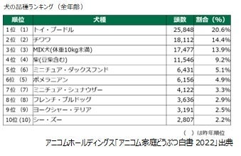 マルプー、チワックス、ポメチワ、チワプー、チワマル、ダップー、ポメプー、トイ・プードル、チワワ、ミニチュア・ダックスフンド、ヨークシャー・テリア、シー・ズー、柴犬、パグ、ポメラニアン、ウェルシュ・コーギー・ペンブローク、ペキニーズ、パピヨン、ミニチュア・シュナウザー、ミニチュア・ピンシャー、マルチーズ、カニーンヘン・ダックスフンド、ジャック・ラッセル・テリア、イタリアン・グレーハウンド、キャバリア・キング・チャールズ・スパニエル、フレンチブルドッグ、ボストン・テリア、ビション・フリーゼ、ビーグル、アメリカン・コッカー・スパニエル