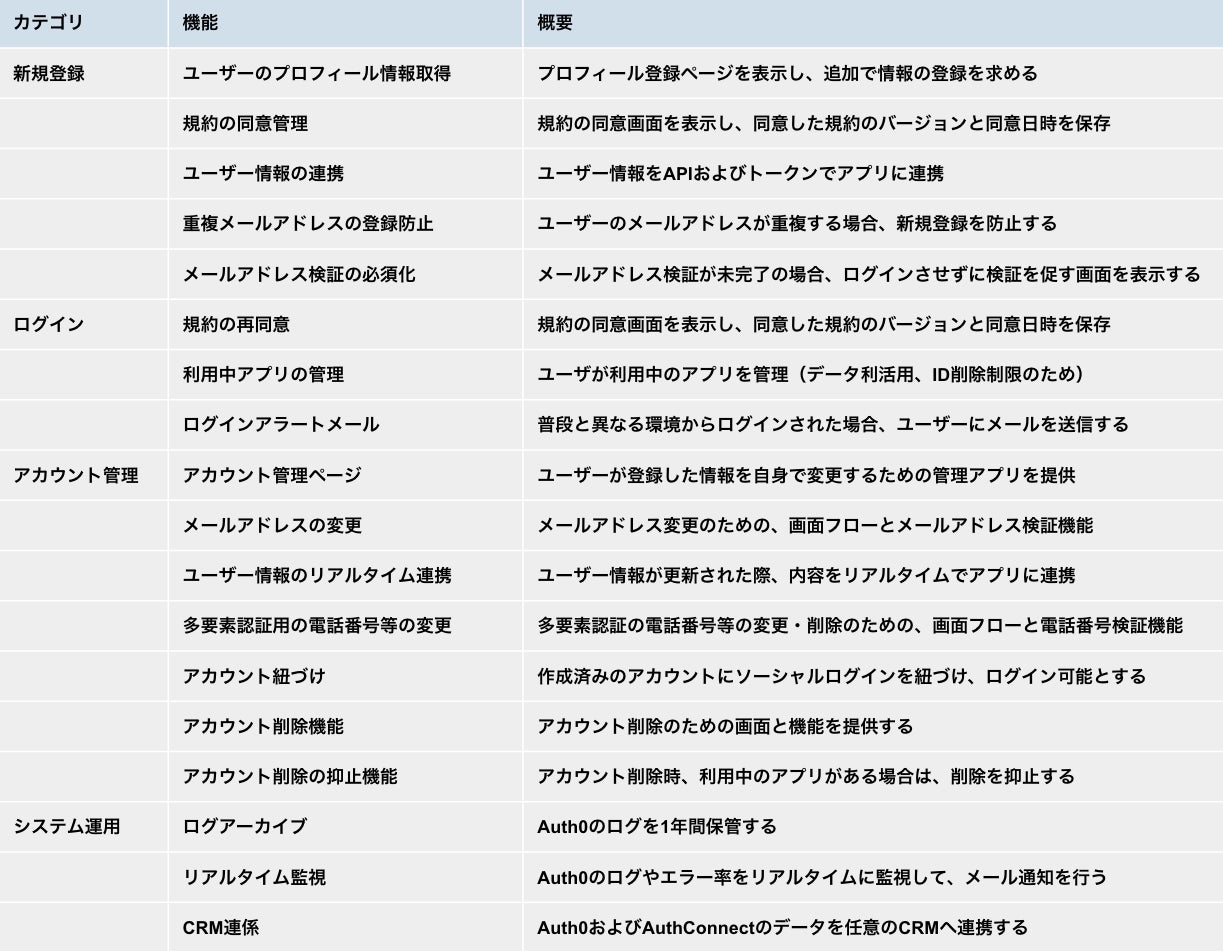AuthConnectは、一般的なID基盤に求められる機能を網羅的に備えています。Auth0 by Oktaをコストを抑えて導入したい企業にはもちろん、本格的な共通ID基盤を安全・確実に運用開始したい企業のニーズにもお応えします。