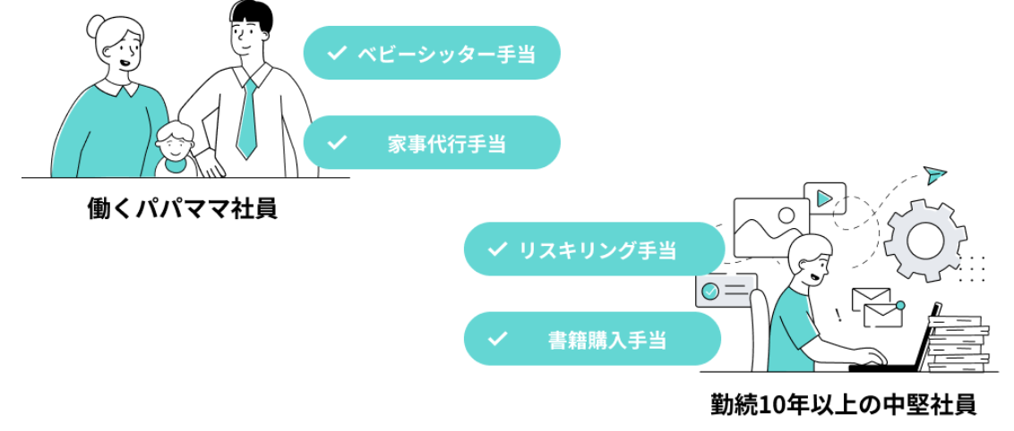 人的資本経営が進む昨今、各開示項目に該当する施策の立案、実行は今後さらに増加すると考えられます。そこで「miive」を活用すれば属性毎での利用制約を設けられるため、開示情報項目にあるエンゲージメント分野で従業員満足度を高めるためのチームランチ手当や、スキル・能力分野でリスキリング手当、育児休業分野でベビーシッター手当など、人的資本投資を実行しやすくなります。