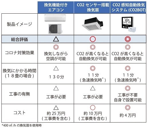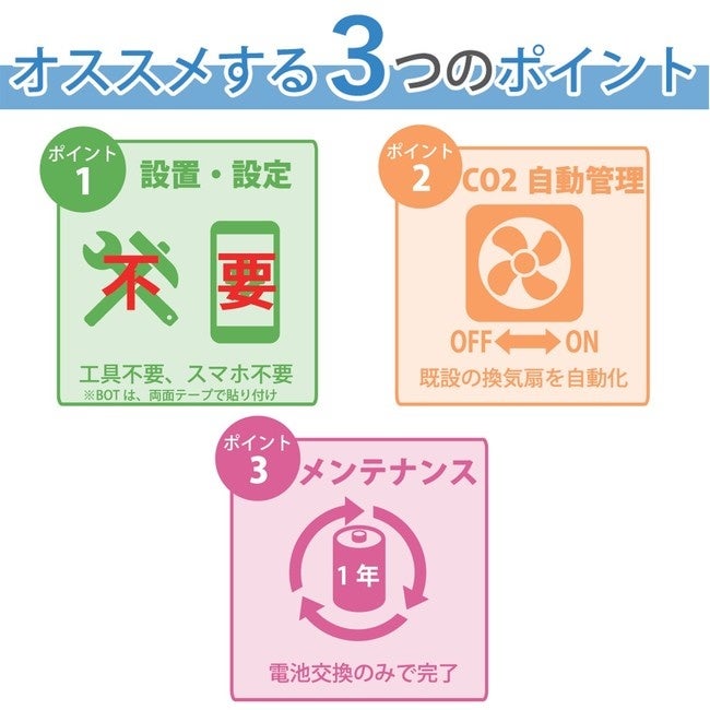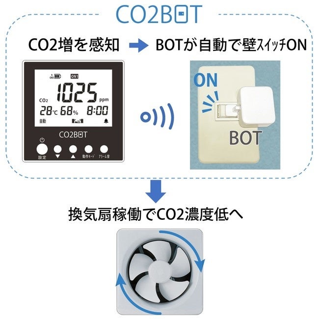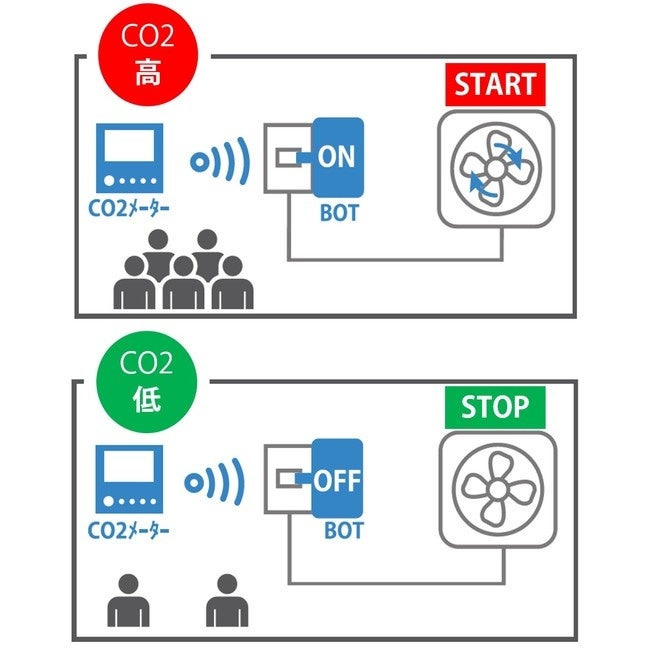 従来はCO2メーターの値を人が確認して換気設備を手動で操作するのが一般的ですが、点け忘れたり点けっ放しになりがちです。CO2BOTを利用すれば自動で必要な時だけ換気扇を作動させるので、感染対策をしながら冷暖房の無駄を最小化する省エネ効果も期待出来ます。感染リスクを低減しながら経済を回していくのに最適なアイテムです。一部のサーキュレーターにも対応しています。