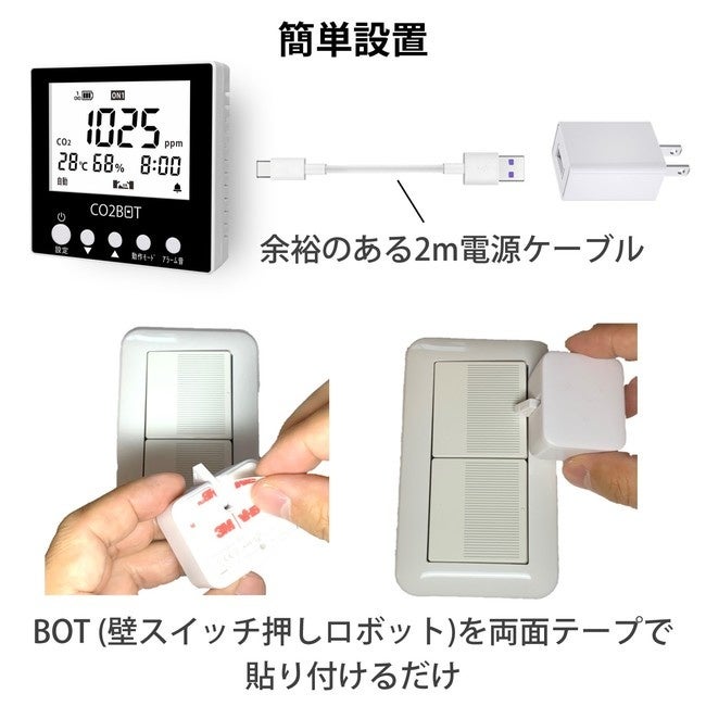 ↑ CO2メーターと壁スイッチロボットから構成されています。双方は無線で通信し、壁スイッチロボットは電池で駆動し両面テープで誰でも簡単に取付が可能です。