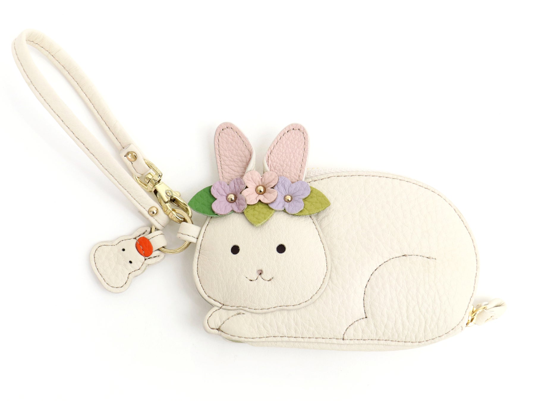 うさぎの「尻尾」に見立てた引手や、イチゴにニンジン、鏡餅になりきった小さなうさぎをチャームに携えた、細やかな手仕事と遊び心にあふれるアイテム。ストラップを取り外して、コインケースのように使うこともできます。
