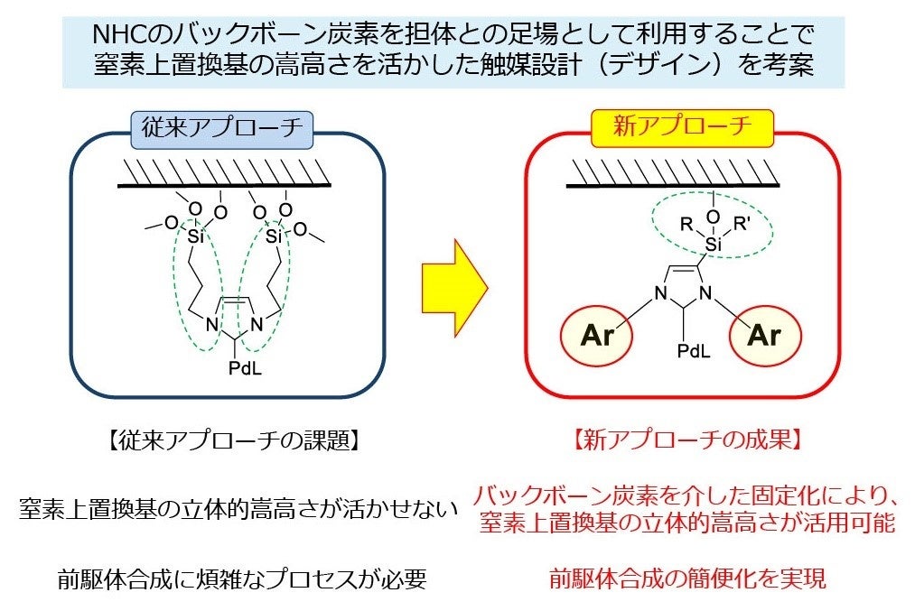 本研究では、さらに上記NHC-パラジウム錯体触媒をポリスチレン樹脂に固定化した「錯体固定化触媒」の合成にも成功いたしました。従来のNHC固定化法では、NHC配位子の特徴である窒素上置換基を固定化部位に利用しており、その嵩高さを十分活かせずに、触媒活性が低下してしまうことが課題でした。今回、バックボーン炭素のシリル基を担体との結合点とした新たな固定化法を考案したことにより、NHCの窒素上置換基を十分活かすことが可能となりました*¹(図1)。