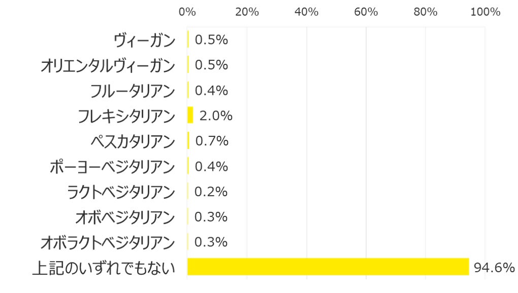 20~60代消費者のうち、ヴィーガンは1.4%、フレキシタリアンとベジタリアンを含めると、ヴィーガン・ベジタリアン消費者は5.4%となった。