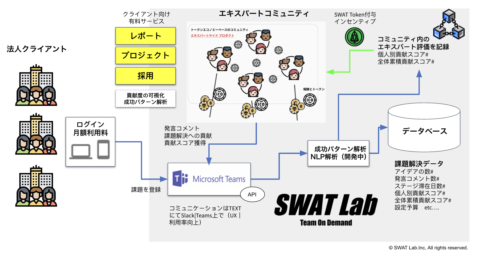 SWAT Labは世界のトップエキスパートで構成された、非中央集権的に運営される分散型ネットワークの構築に取り組んでいるスタートアップ企業です。企業が課題を投稿すると、社内で利用されているマイクロソフトTeamsの会話からAIが課題を予測して、必要なエキスパートが自動的にチャネルにアサインする仕組みとなります。