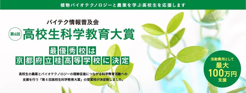 第6回となる本年は、全国各地の高等学校から合計13件の応募を頂きました。小泉 望氏(大阪公立大学大学院 農学研究科 教授)、小島 正美氏(食生活ジャーナリストの会・前代表)、高島 賢氏(農林水産省 消費・安全局 農産安全管理課 審査官)の外部委員及びバイテク情報普及会 会員企業から成る選考委員会において、各校より提出された申請書類に基づき厳正な審査を重ねた結果、下記の高等学校を授賞校に選定し表彰するとともに、その活動を支援することを決定いたしました。