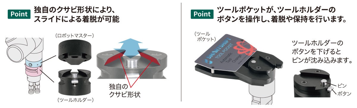 ツールポケットが、ツールホルダーのボタンを操作し着脱や保持を行います。