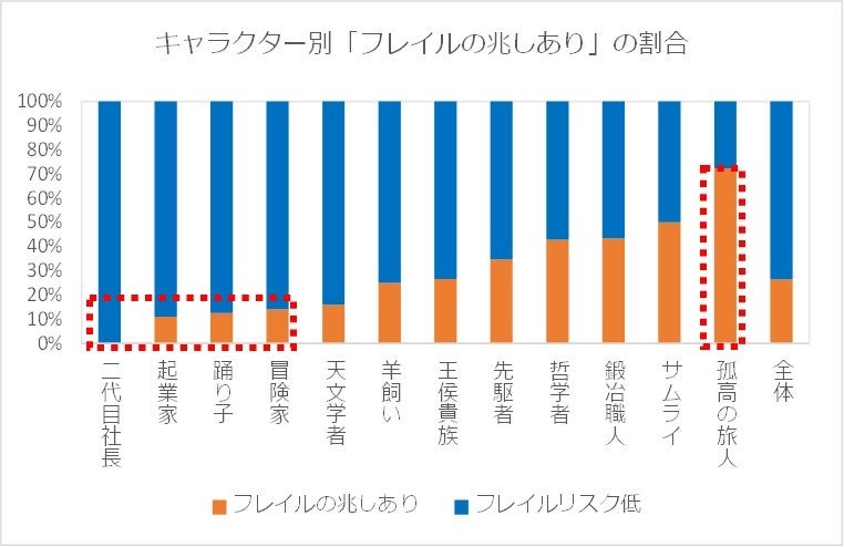 キャラクター別に「フレイルの兆しあり」と診断された割合を集計したところ、割合の高いキャラクターは「孤高の旅人」、低いキャラクターは「冒険家」「起業家」などとなりました。「孤高の旅人」はビックファイブ理論で人の性格を構成するといわれている5因子のうち「外向性」が低く、「冒険家」「起業家」は「外向性」や「開放性」が高いキャラクターです。積極的に人や社会と関わる性格がフレイルリスクの低さにつながるのではと考えられます。