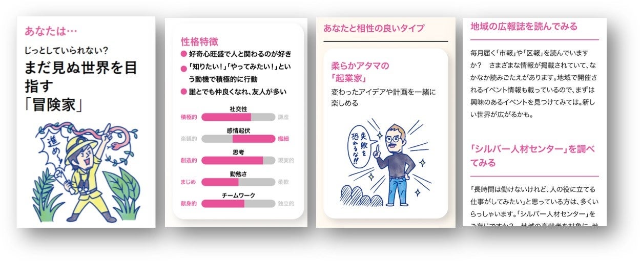 「超じぶん診断」は、多くの適性診断のベースとして活用されているビッグファイブ理論(※1)に基づいた質問やフレイルリスクをチェックする質問(※2)に答えていくと、性格に合ったキャラクターが診断され、その方の性格と体の状況に合わせたフレイル予防アドバイスが受けられるWEBアプリです(利用料無料)。